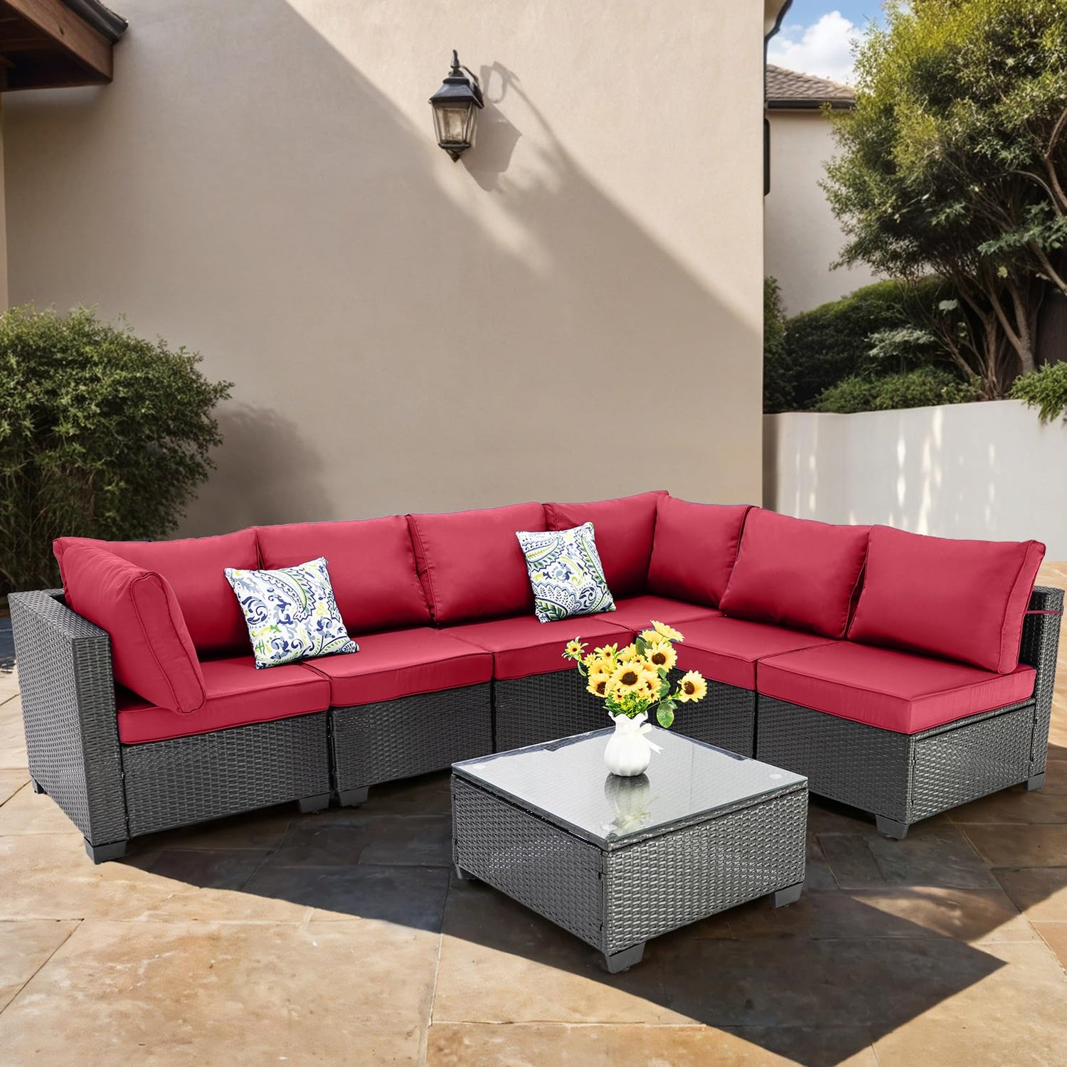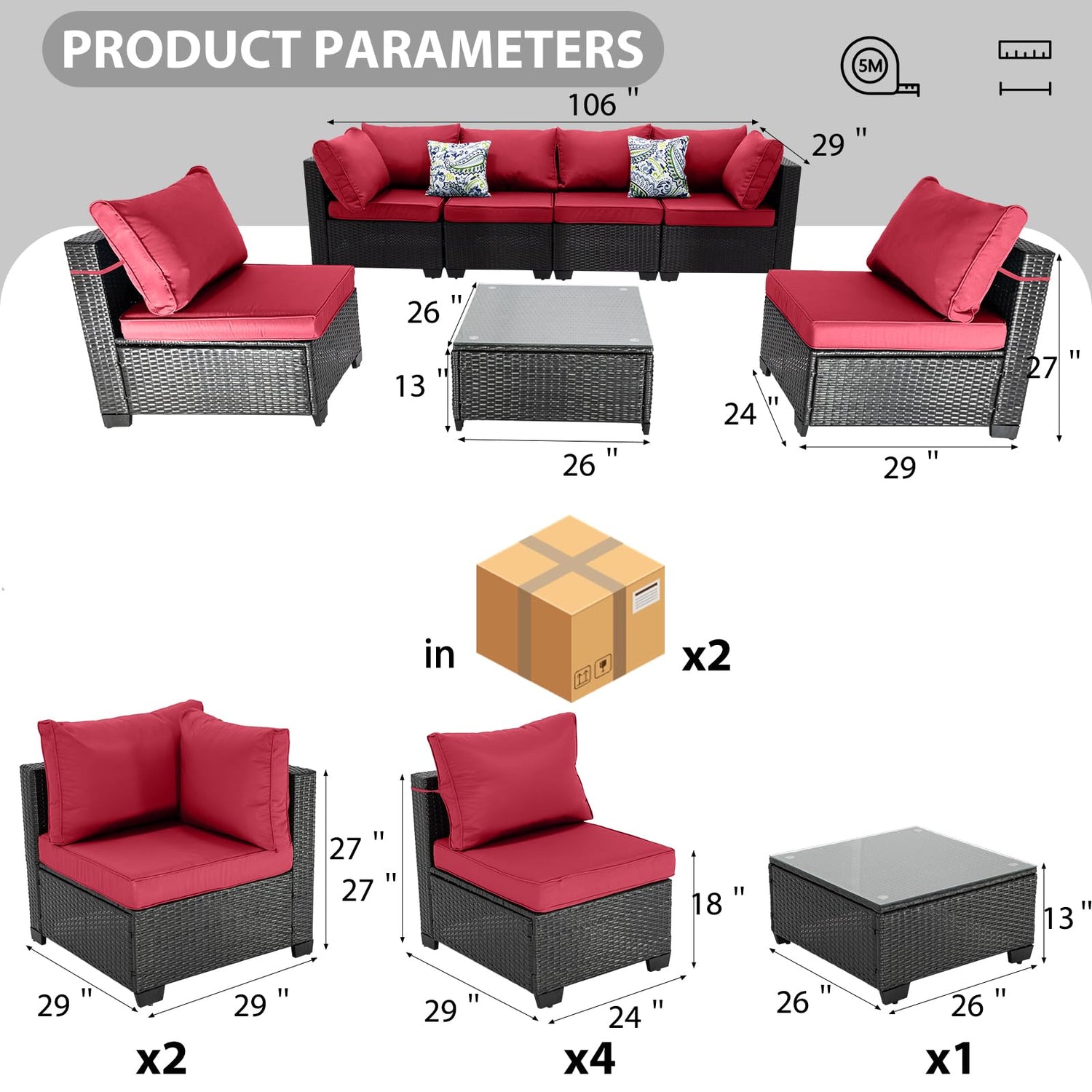 OUGMMGOU 7 Piece Patio Furniture Set, All-Weather Wicker Outdoor Conversation Set with Sectional Sofa, Rattan PE Wicker Seating, Glass Coffee Table, and Cushions (Coffee-Red, Z7)