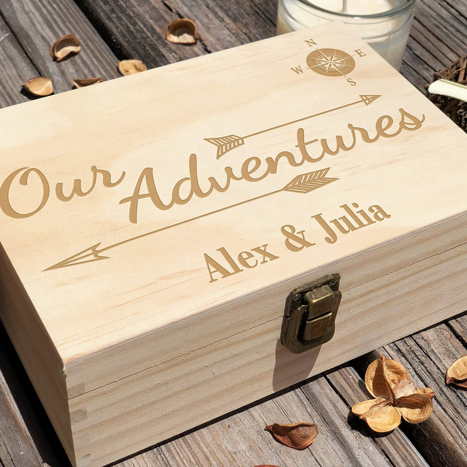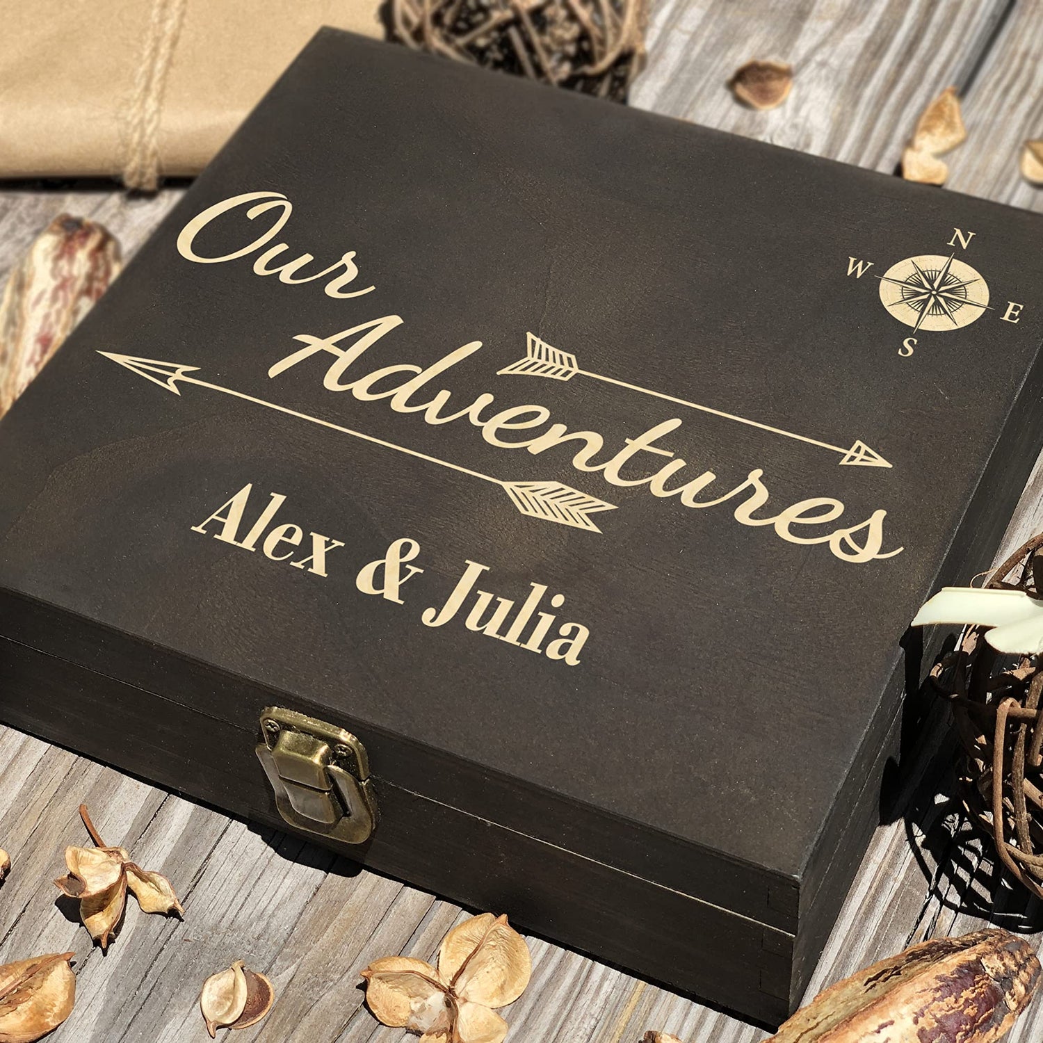 Details: This beautiful keepsake box can become a perfect gift for anniversary, wedding, birthday, Christmas or any other significant date. This unique box is created to store all your adventurous memories. You can keep there photographs, plane tickets, stubs from concerts… everything will be kept in one place and you will be happy to open it again and again. It is a high quality laser engraving. External Dimensions: 8.5 x 8x 2.5 in. Internal dimensions: 7.75 x 7.3 x 1.87 in