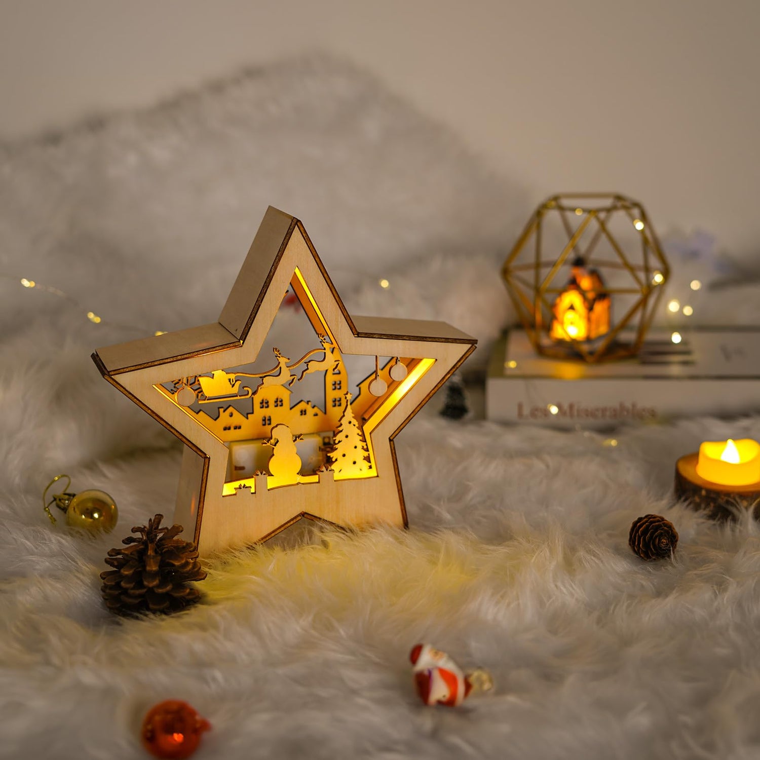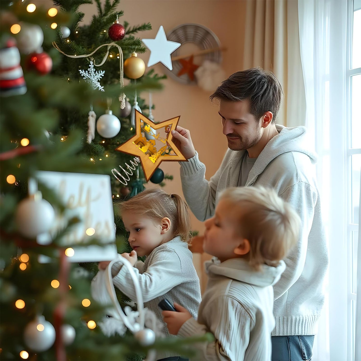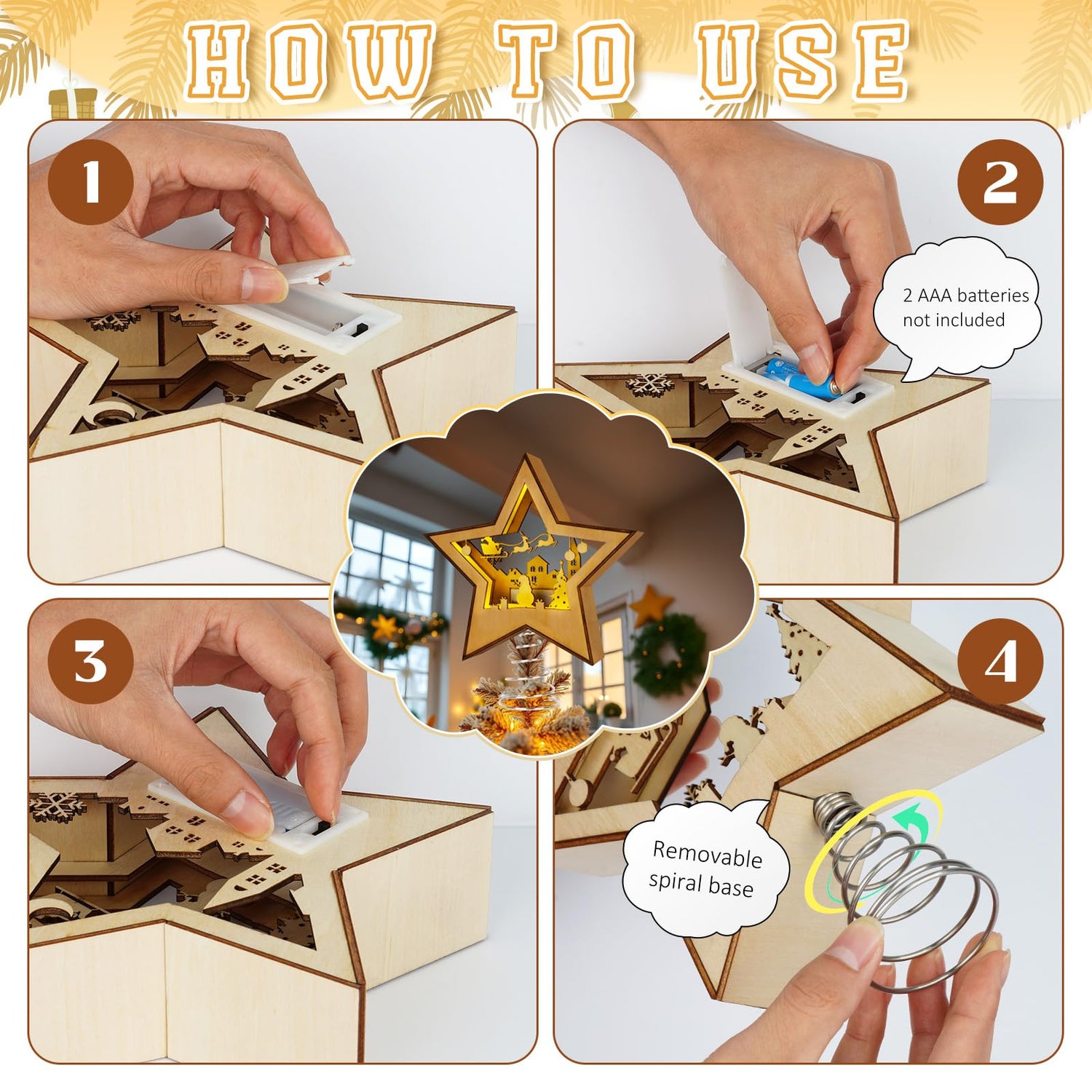 • High-Quality Materials: Crafted from premium basswood and stainless steel, this Christmas tree topper lighted is designed for durability and long-term use. The basswood star offers a natural, rustic charm, while the stainless steel base provides sturdy support, ensuring the xmas tree topper remains securely in place on your tree or surface.