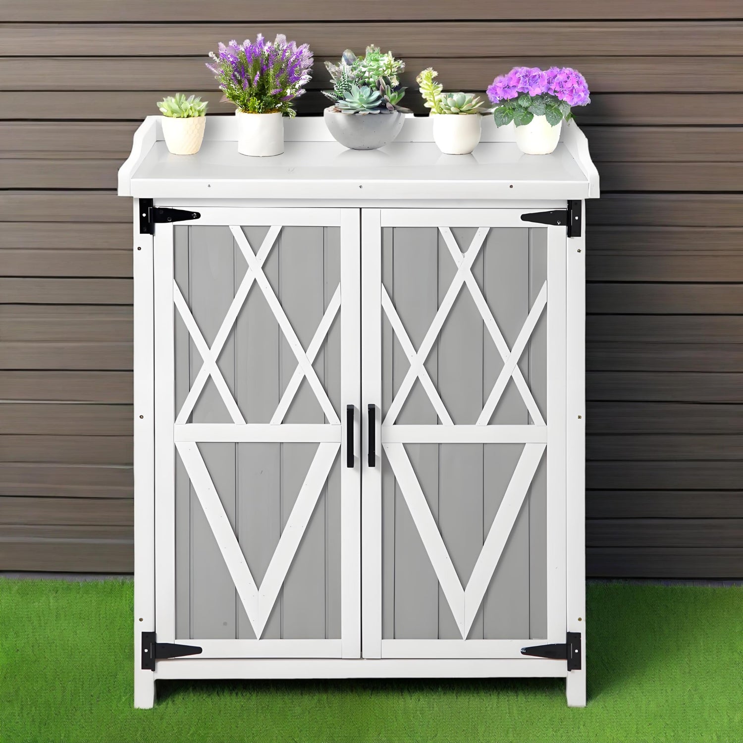 Details: Introducing our Outdoor Cabinet with Metal Tabletop Garden Potting Bench Table, the perfect addition to your garden, patio, or lawn. This versatile and durable wooden storage cabinet is designed to meet all your outdoor storage and gardening needs. Featuring a sturdy metal tabletop, it provides a reliable workspace for potting plants, arranging flowers, or any gardening task, while the weatherproof wooden cabinet ensures your tools and supplies stay protected from the elements.