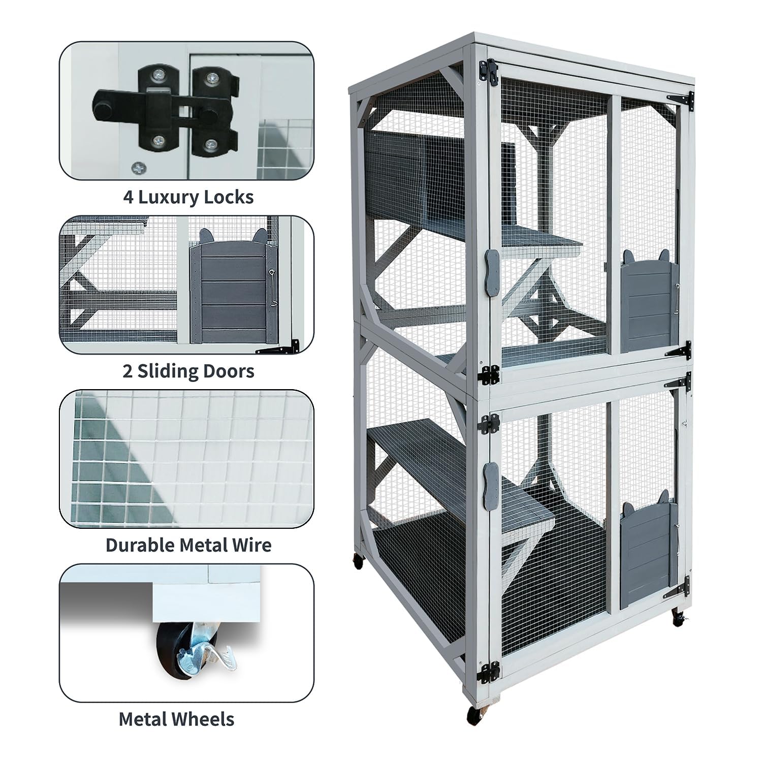 - 【Age-Friendly Design】--The stepped platform shape ensures ease of movement for cats of all ages and sizes, making it simple for them to navigate up and down, promoting active play and exploration. With 4 braked wheels and a removable PVC bottom layer, you can move this wooden cat enclosure from indoors or outdoors.