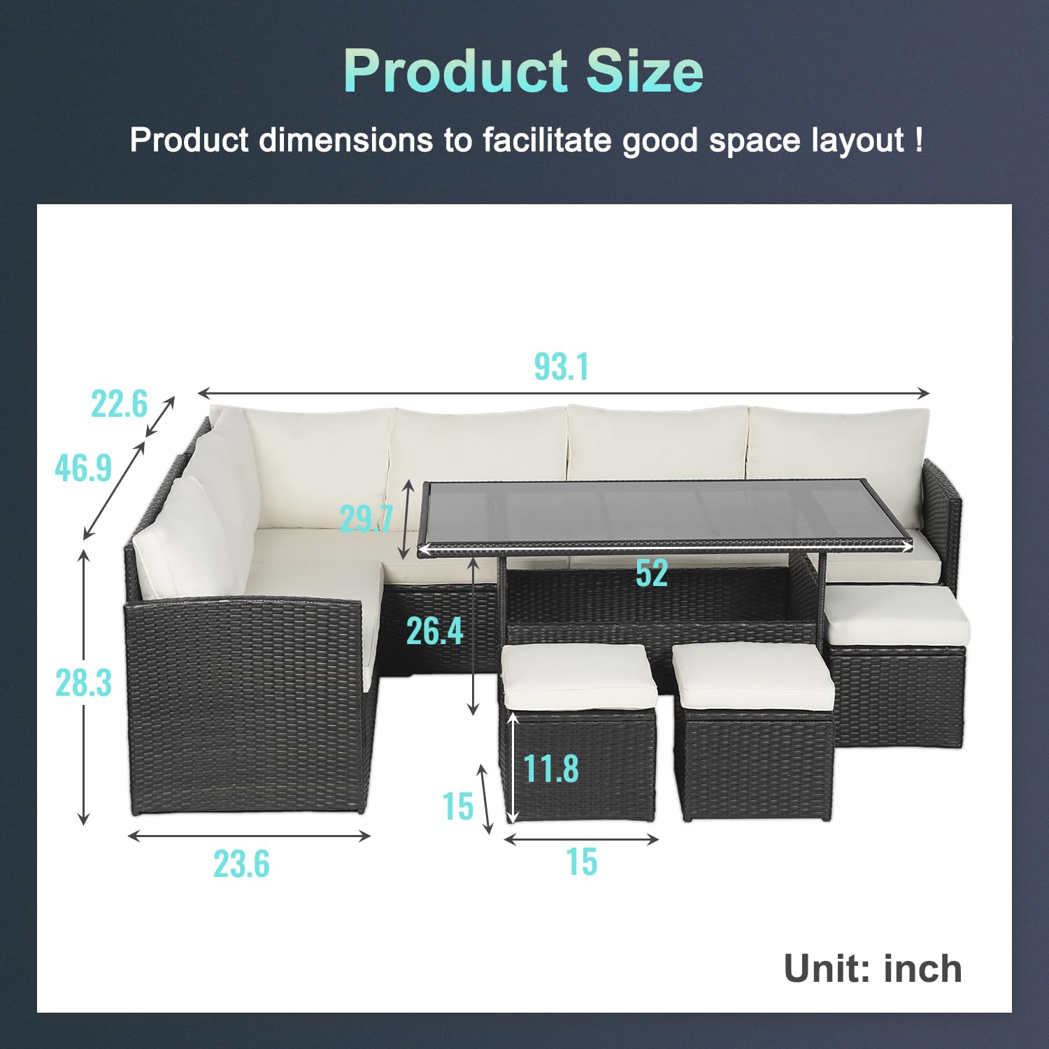 Outdoor Dining Sets 7 Pieces Patio Dining Table Set 9 Seats Rattan Outdoor Furniture Set with Glass Dining Table Sectional Sofas Ottoman Cushions for Patio Backyard Poolside Outdoor, Khaki