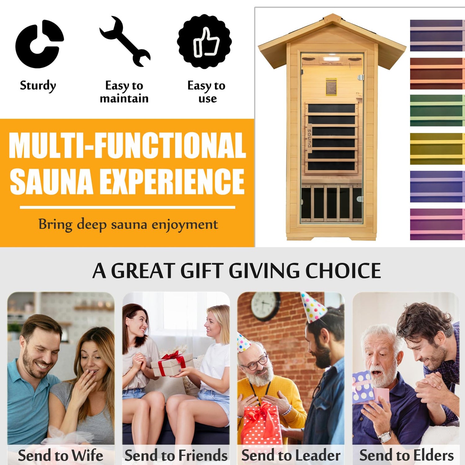 - Versatile Sauna Experience:The sauna outdoor built in Bluetooth speakers, LED reading light, and 7 color light therapy system.After a long day at work, relax in the garden sauna while reading, listening to music, etc .
