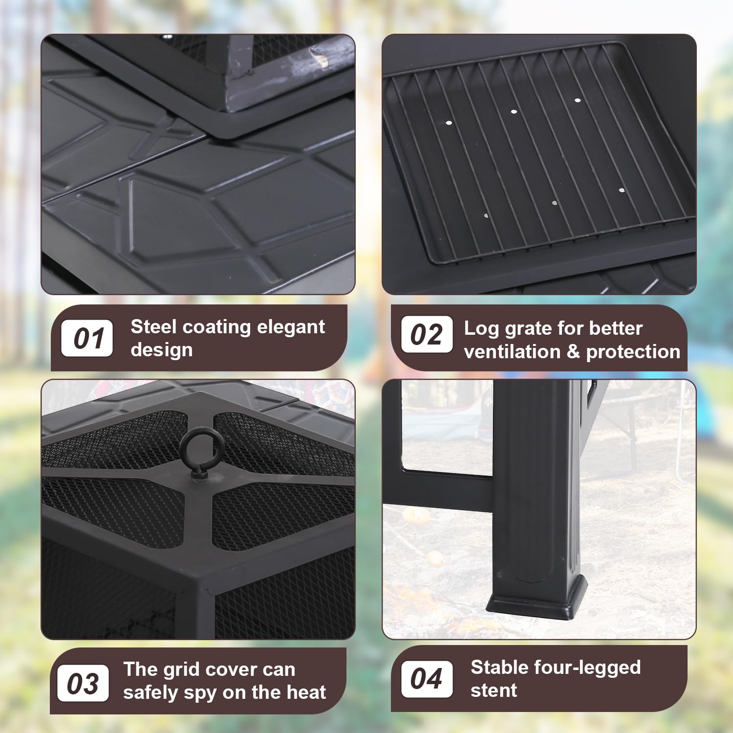 - Durable Construction: Built with a robust metal frame, this fire pit ensures long-lasting performance and stability for all your outdoor occasions. The rust-resistant coating keeps it looking elegant and protects against weather elements, and ideal for year-round use. Its sleek square design adds a touch of modern charm to any outdoor setting, blending functionality with style.