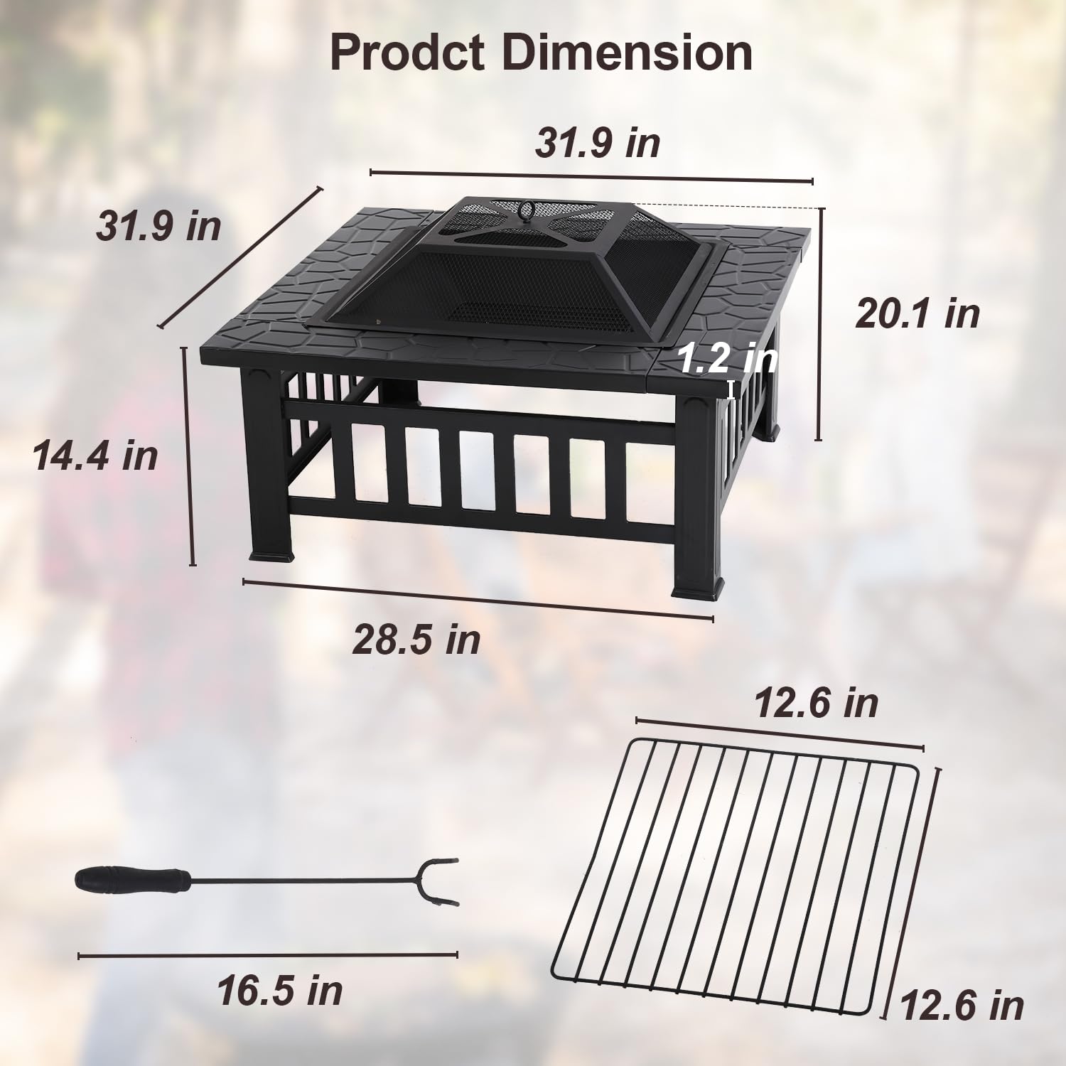 Outdoor Fire Pit 32 Inch Square Metal Firepit Mutltifunctional Fire Pit with Mesh Cover Poker for Outside Backyard Gathering Camping Bonfire, Fireplace for Outdoor Heating Patio Garden