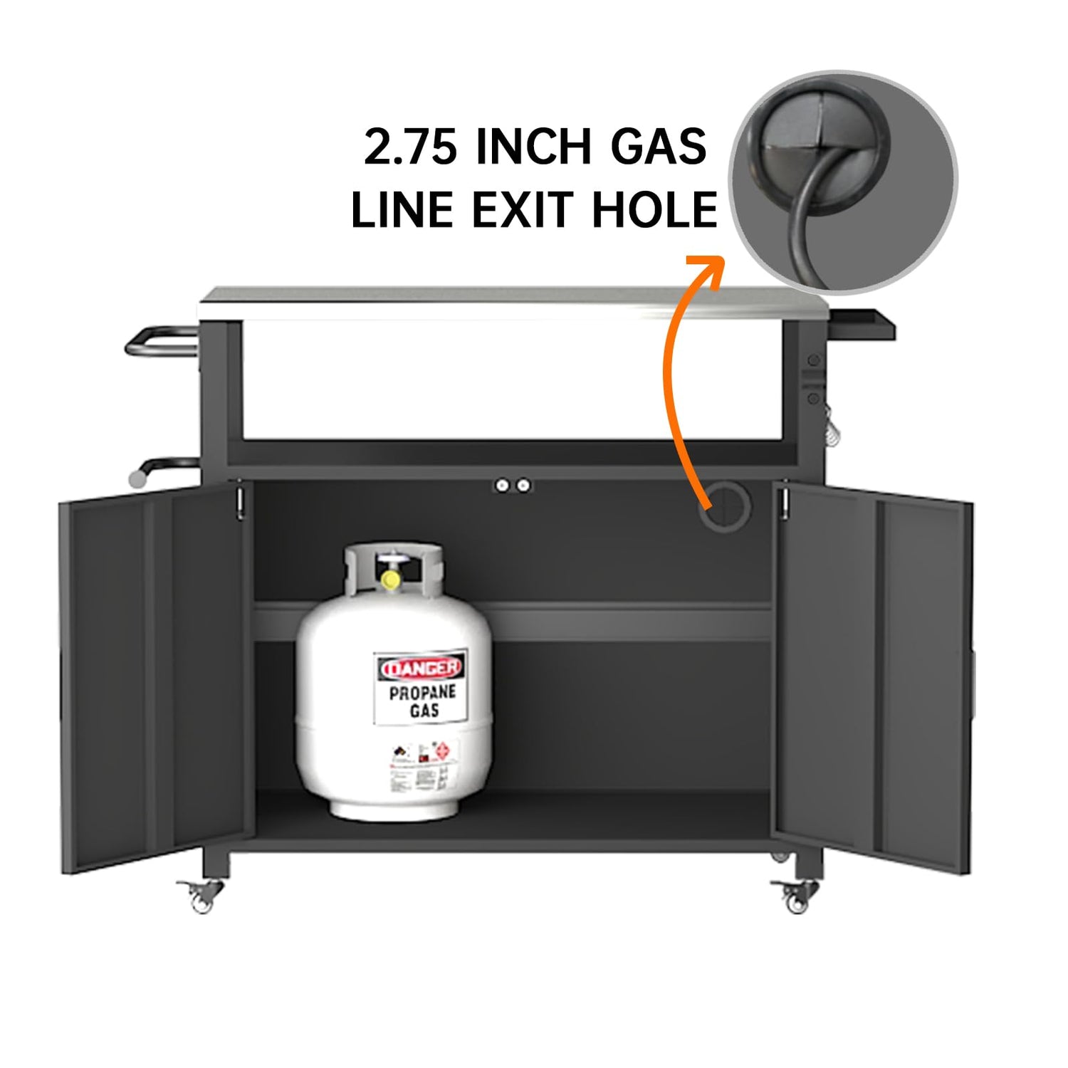 - Large Capacity: There is enough space for you to store and look neat and organized. The cabinet can hold cylinders the back has 70mm holes for gas line connections