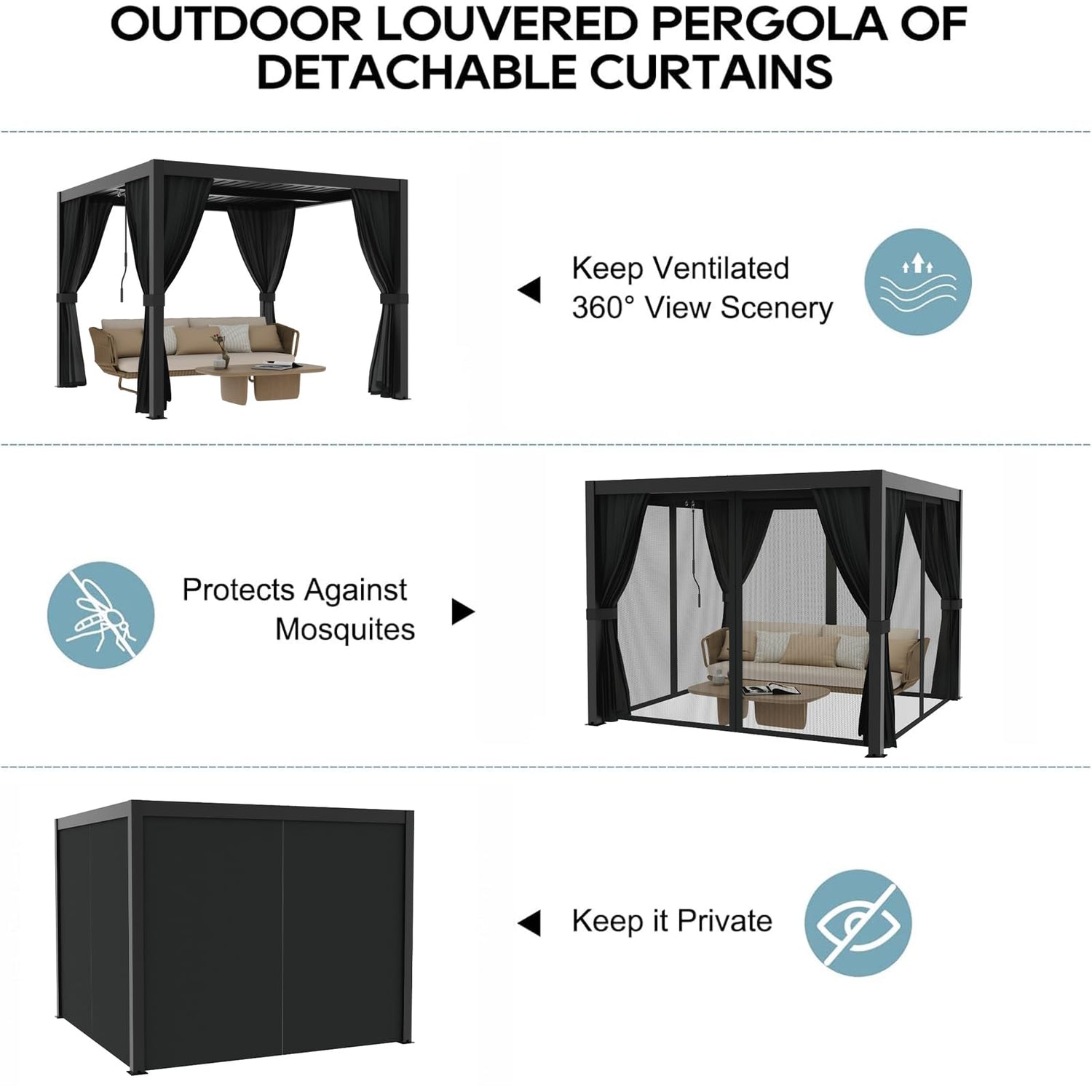 - Curtain and Nets: Our pergolas come with removable curtains and nets that protect against insects and rain while ensuring privacy. These side walls provide added protection from sunlight, UV rays, rain, snow, and mosquitoes. Enjoy the safety and comfort of your outdoor pergola