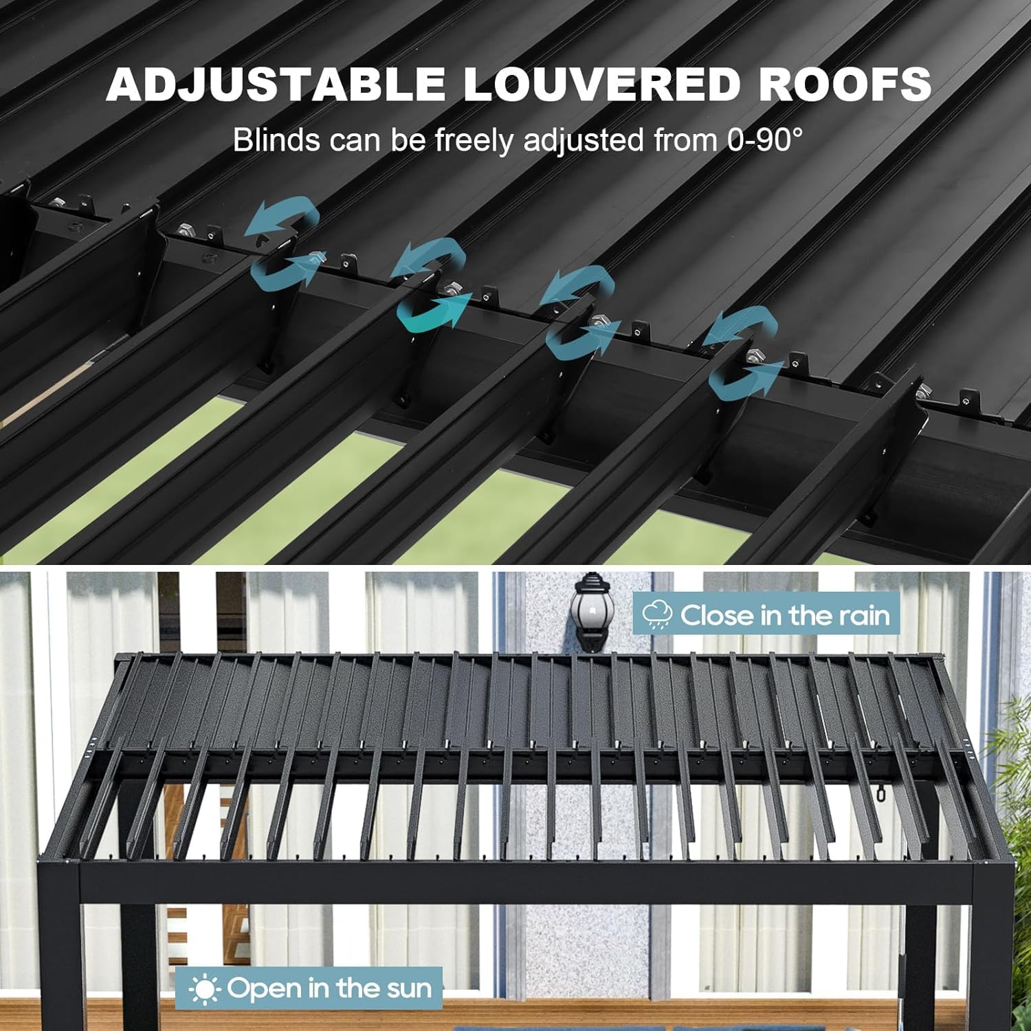 - Independent Adjustable Louvered:The independent louvered roof design of this aluminum pergola allows you to adjust the angle effortlessly from 0° to 90° to obtain the amount of sun or shade you receive. Besides, it is also a great shelter from the rain when closed completely