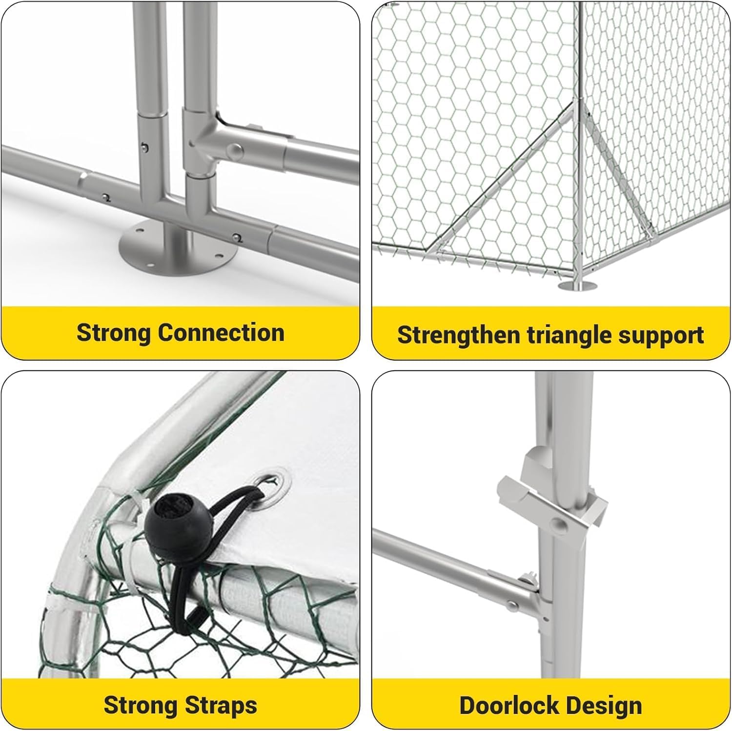 - 【Heavy-Duty Galvanized Steel Frame】0.8mm thick galvanized steel pipes (anti-rust coating) + chew-resistant mesh. Supports harsh weather and heavy use for 5+ years durability. Ideal for farms/backyards.