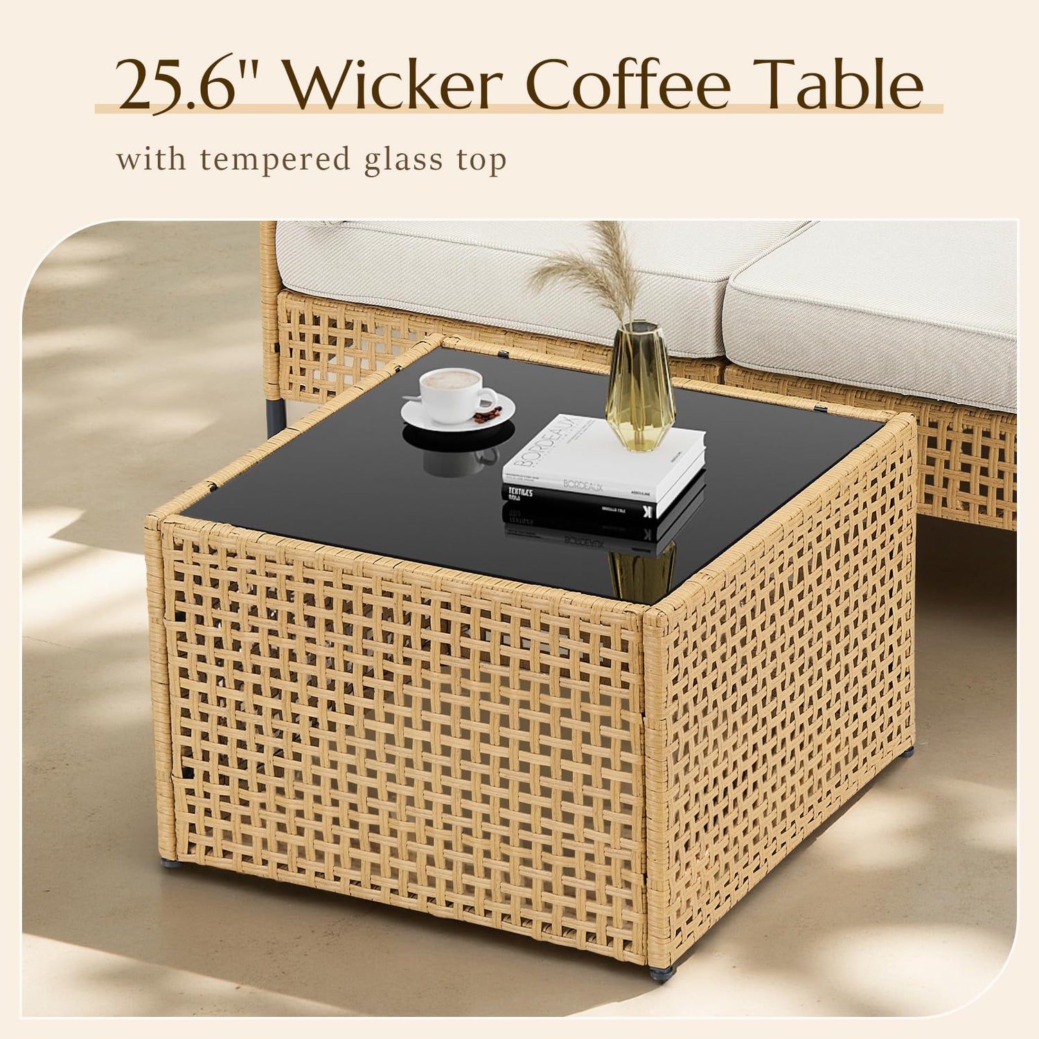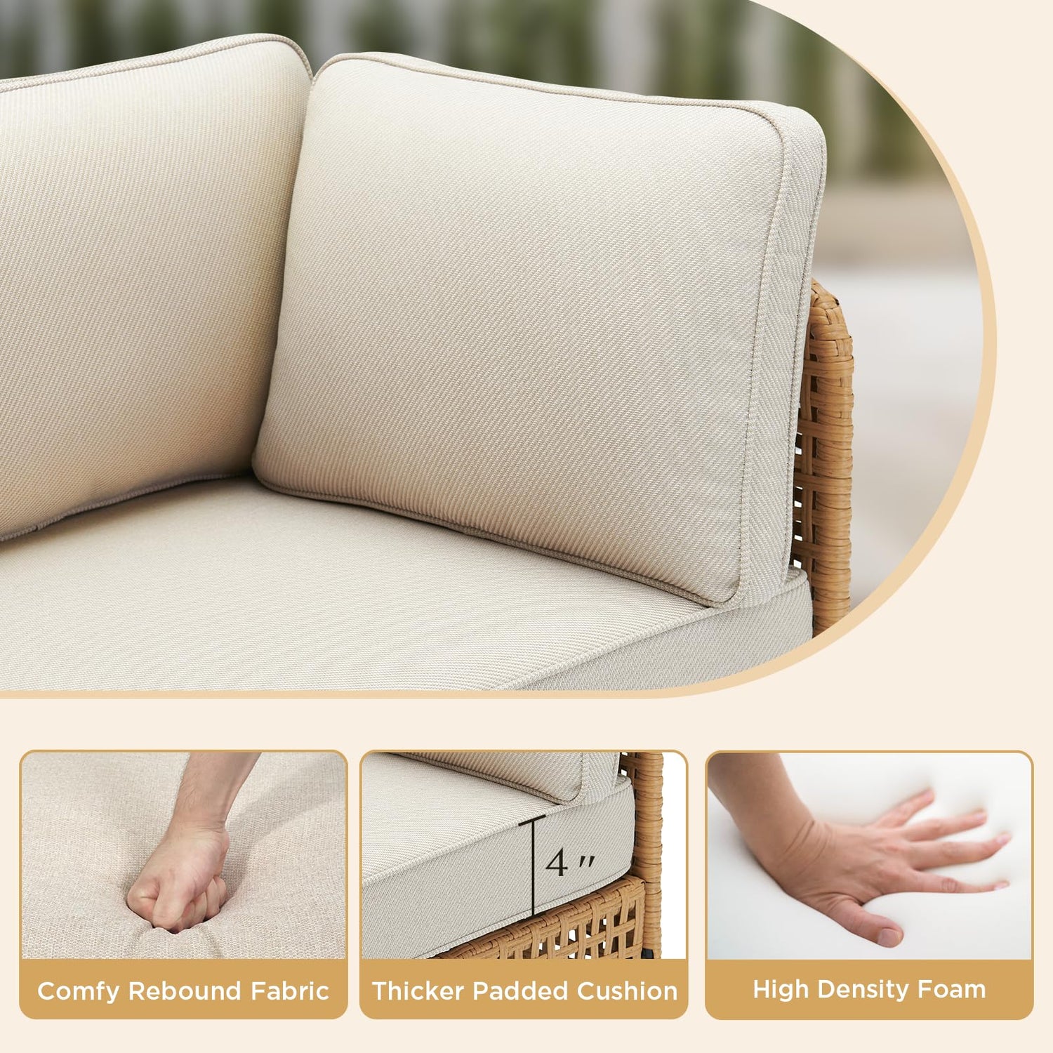 - 【Boho-Inspired Design】 Styled in beige tones with clean lines, this conversation patio furniture blends boho charm with modern elegance. The open basket weave wicker and metal legs complement various home styles. Cushions stay in place with anti-slip straps, keeping your patio set tidy. Ideal for patios, balconies, or gardens, this set adds a cozy, stylish look to your outdoor sectional space