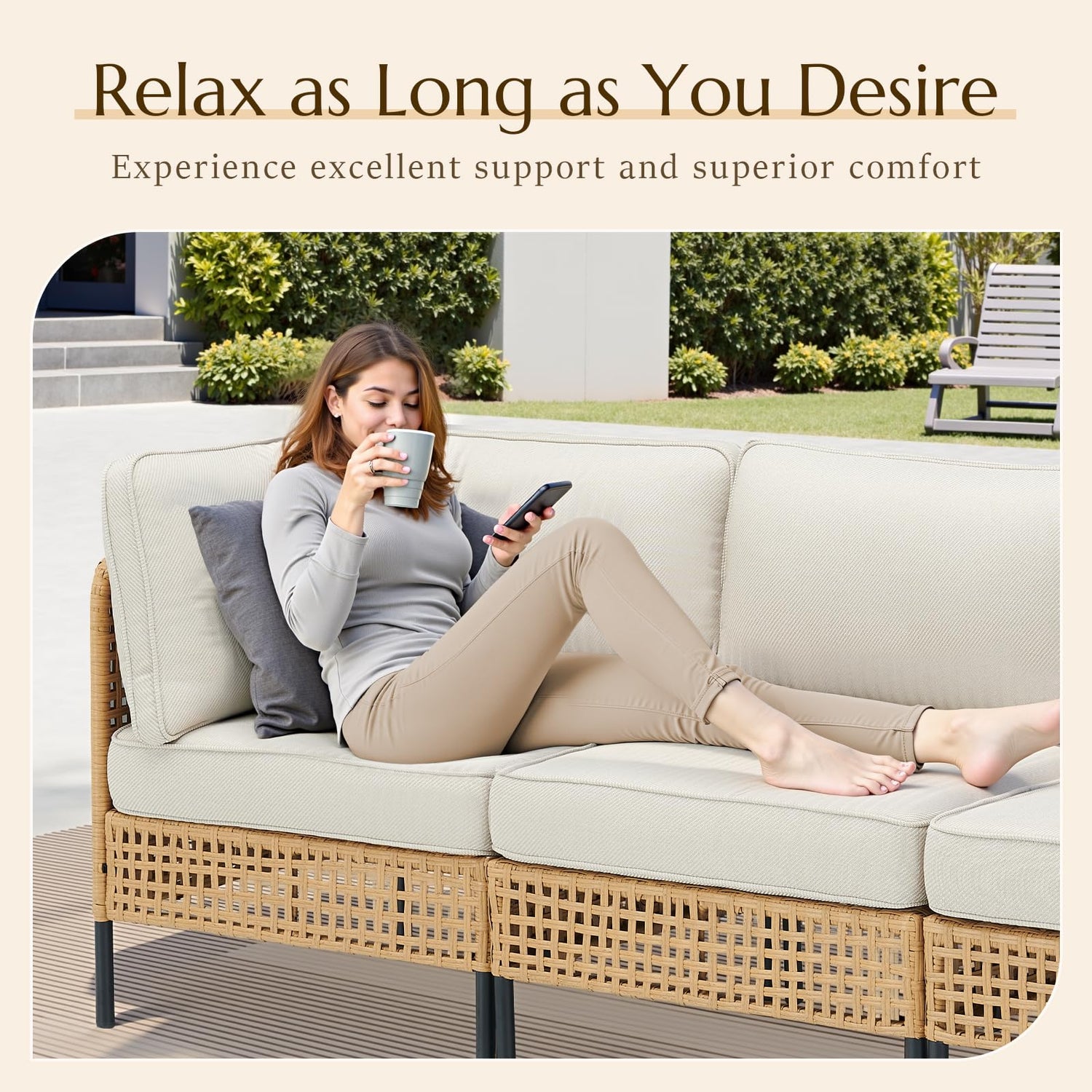 - 【Modular & Versatile Seating Arrangement】This outdoor sectional set includes Whether you're entertaining a crowd or just relaxing solo, the modular design allows you to rearrange the layout to fit your space. All sectional seats come with connector clips to prevent separation, ensuring a stable and unified setup. Each seat supports up to 350 lbs, combining generous weight capacity with practical flexibility—perfect for adapting your patio sectional furniture set to any occasion