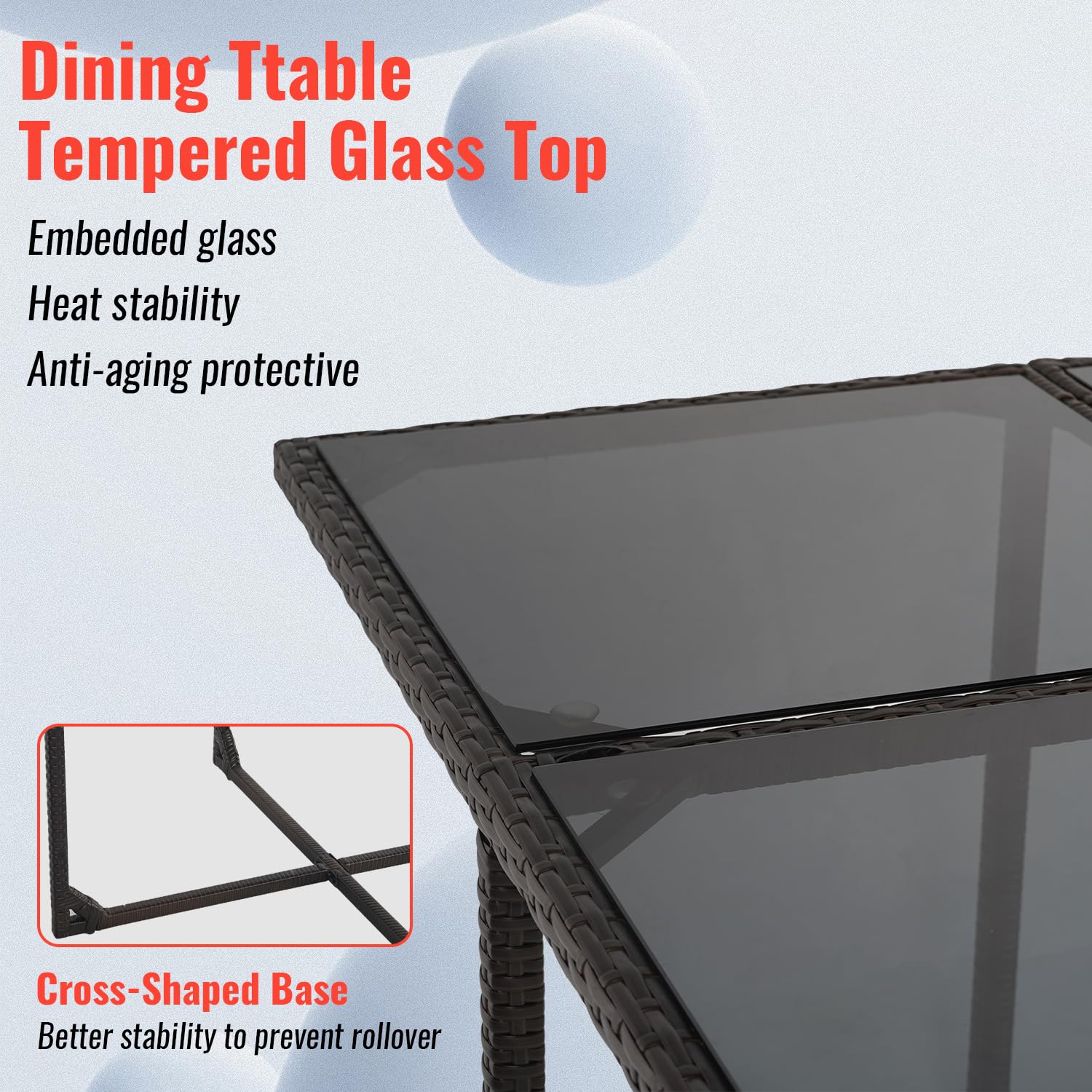 - The table in the patio dining set is made of high-quality tempered glass for drinks, food and any beautiful decorations.