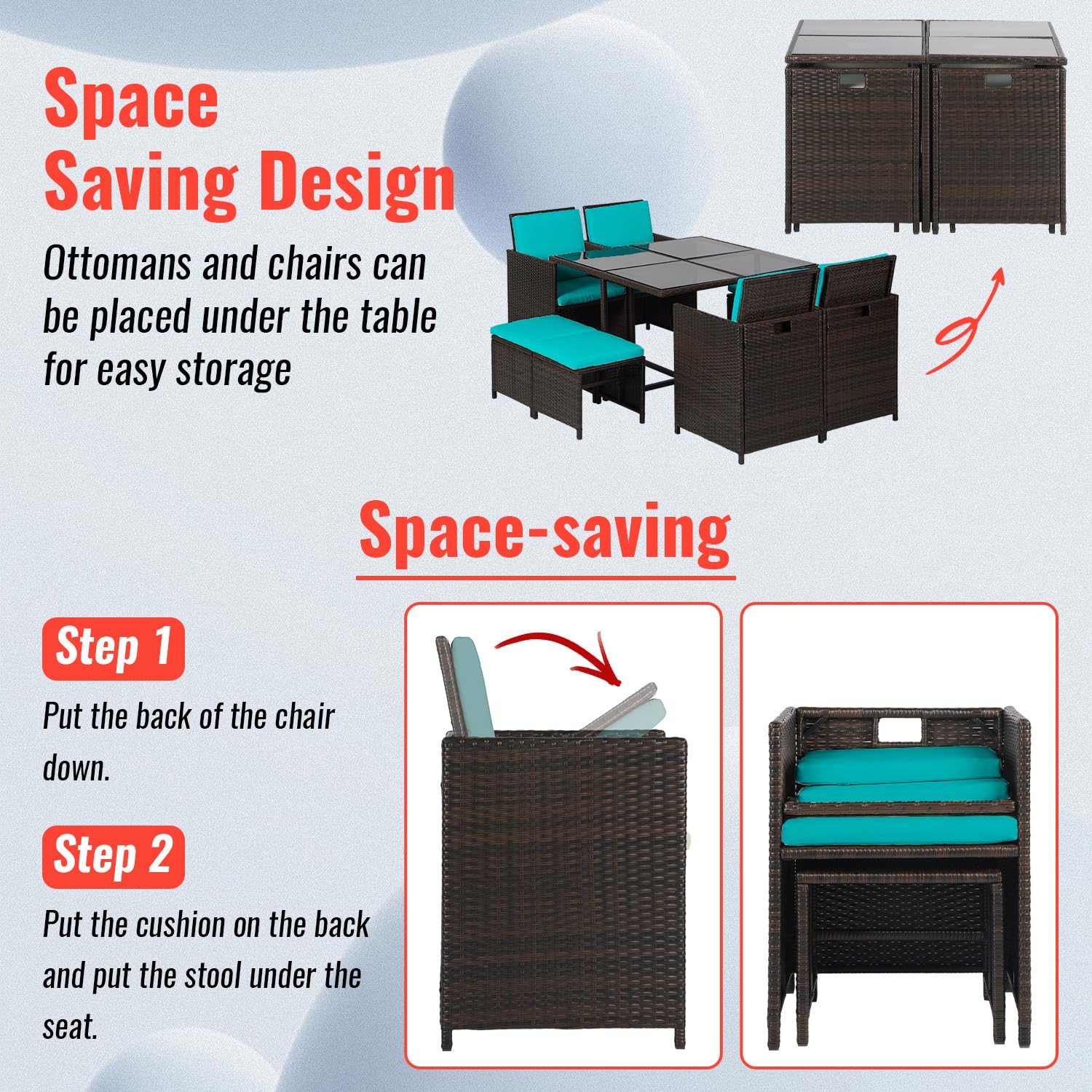 - Bring the comforts of your kitchen and create a lovely area to lounge outside on your patio, by the pool, or gathered around the garden.This 9-piece PE plastic rattan dining set has four space-saving armchairs, four easy-store ottomans, and a center dinner table.