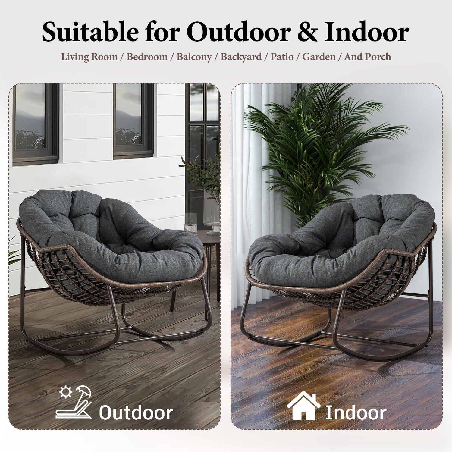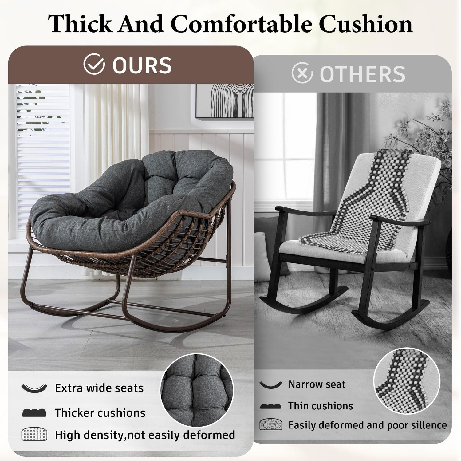 Outdoor Patio Rocking Chair, Oversized Papasan Chair with Cushion and Frame, Comfy Rattan Wicker Egg Chairs Indoor, Modern Lounge Rocker for Front Porch Living Room Bedroom (Dark Grey, Set of 1)
