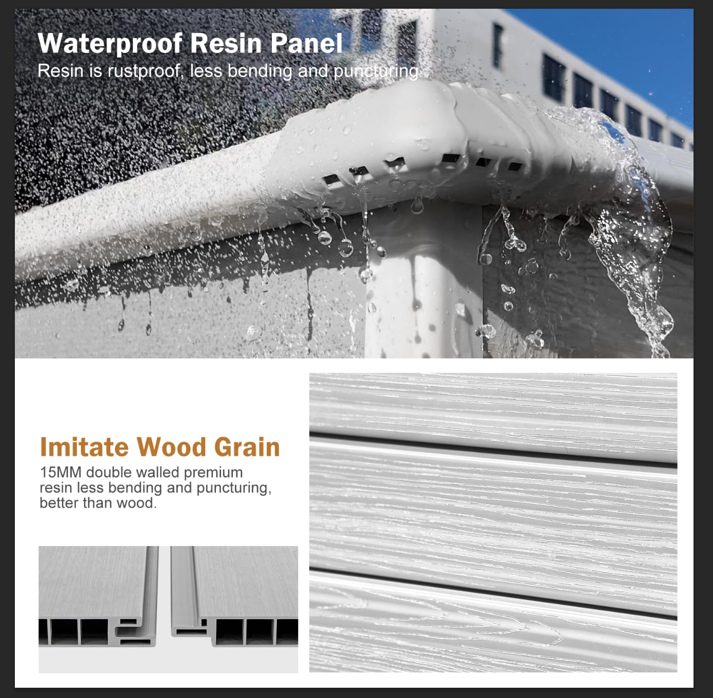 - WATER RESISTANT: Resin and plastic mix material with painted outter, make the shed waterproof. All parts are plug in tightly. We also provide silicone sealant to make the panels fit more tight and prevent potential leaks