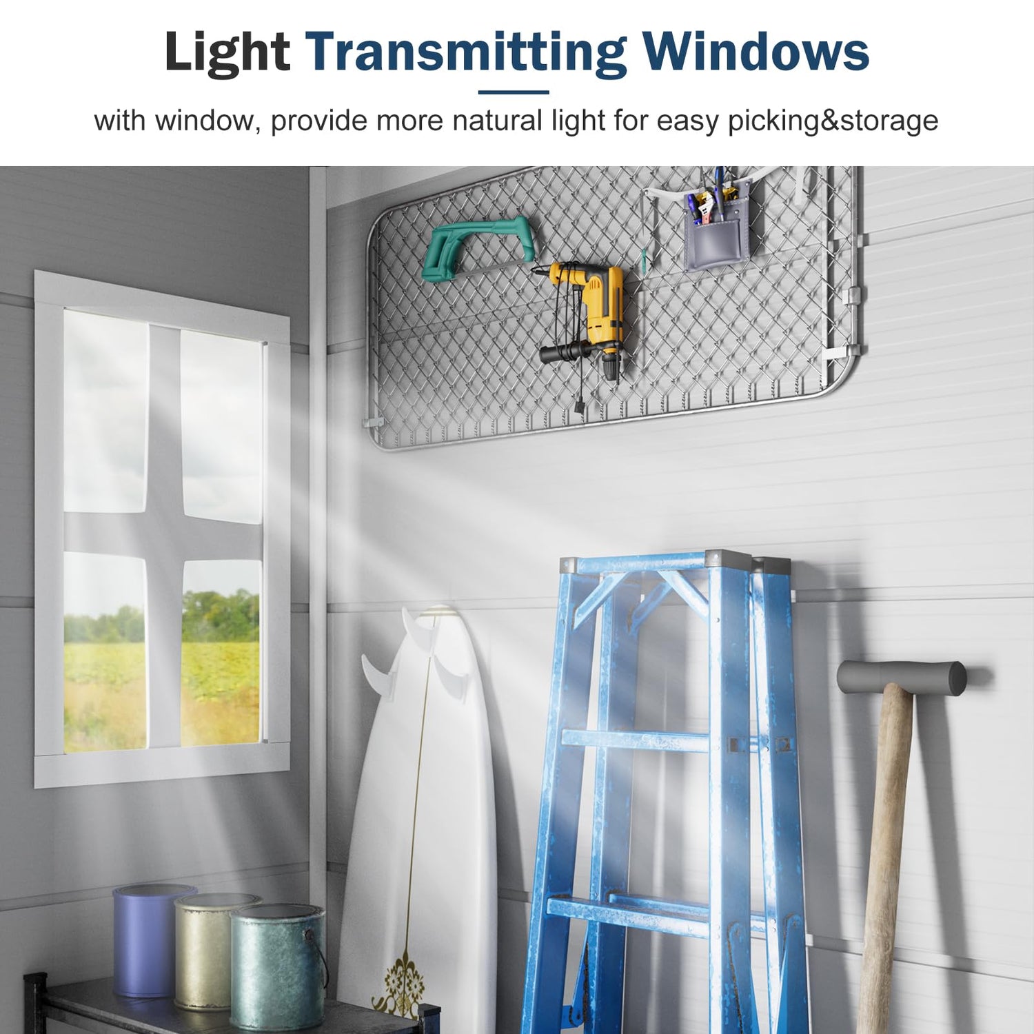 - 【Practical Design】This outdoor waterproof storage shed features a sloping roof, preventing water accumulation. The lockable door enhances security and prevents accidental entry of small animals. T-holes in the side frame allow hooks to hang something like baskets and ponchos. The vents, window and the top reflector design provides plenty of natural light and ventilation. It allows the visibility of tools from the outside and enhances the aesthetics of the shed