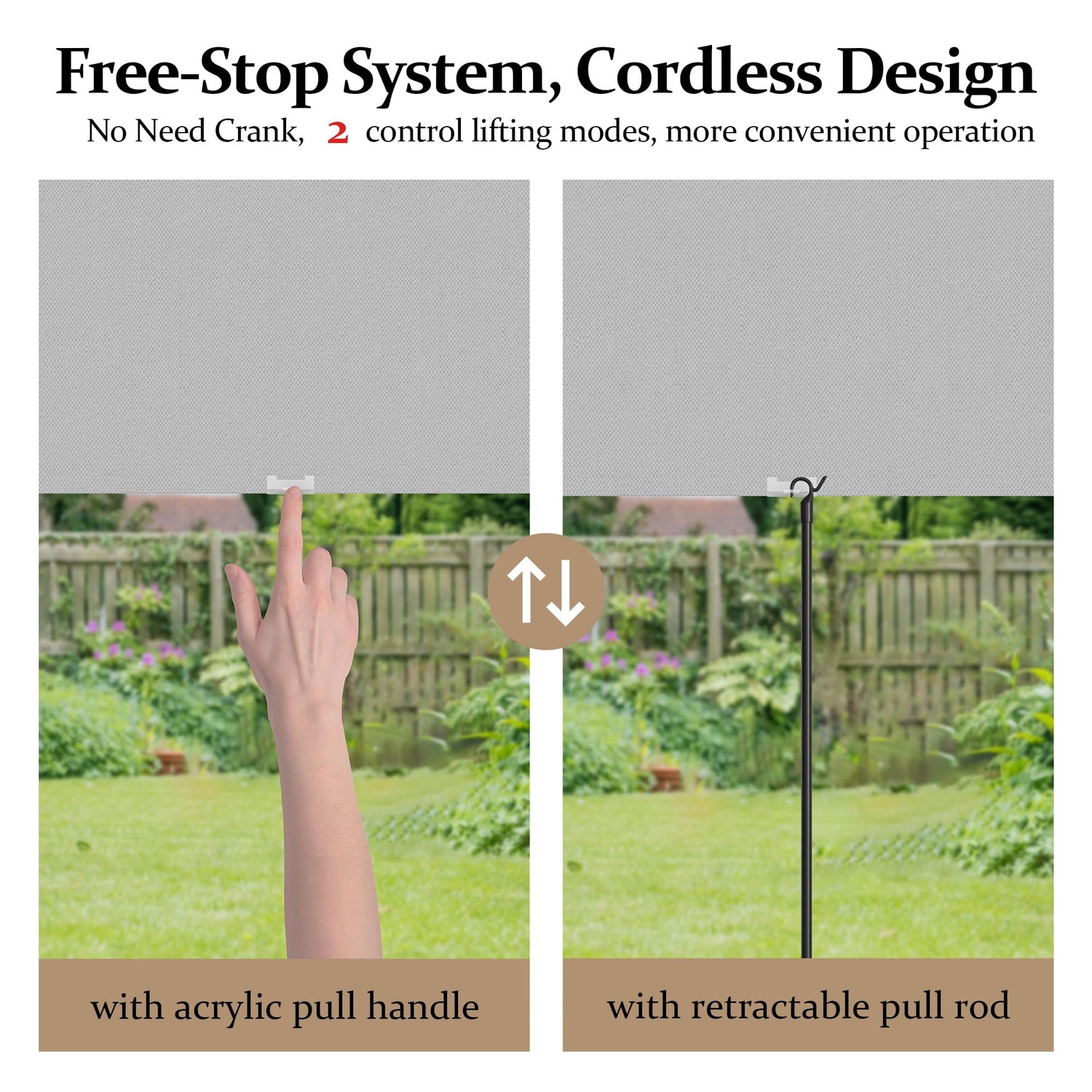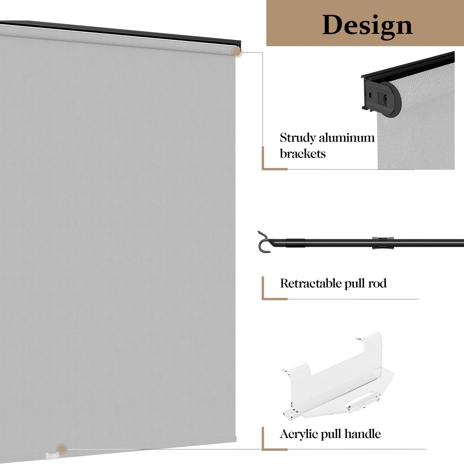 - 【No Need Crank-More Convenient Operation】Abandoning the traditional operation method of outdoor shade with cranks, this outdoor roller shade is operated by pulling down and pushing up, you can push and pull the outdoor shade directly by hands to control the rise and fall of the it, or you can use the equipped pull rod to operate it, which is more fast and very convenient.