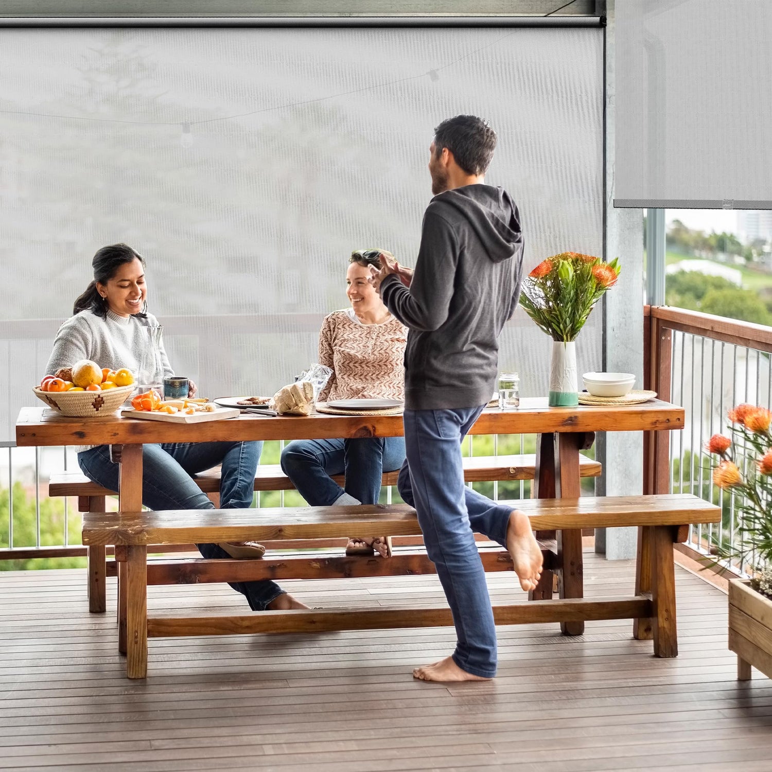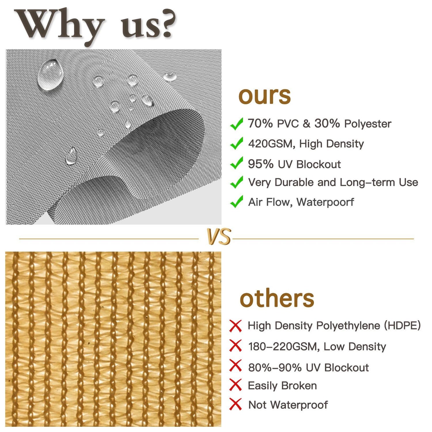 - 【New Materials-95% UV Blockout】Different from ordinary outdoor shade, our outdoor shade material is upgraded, which is made of 70% PVC & 30% Polyrster's Teslin Fabric. It has excellent ultraviolet effects and can block 95% of UV. At the same time, Teslin Fabric has a good breathability, you will never feel sultry. In addition, the excellent production technology makes this outdoor roller shade have an excellent windproof effect, can effectively prevent the stimulation of wind and sand.