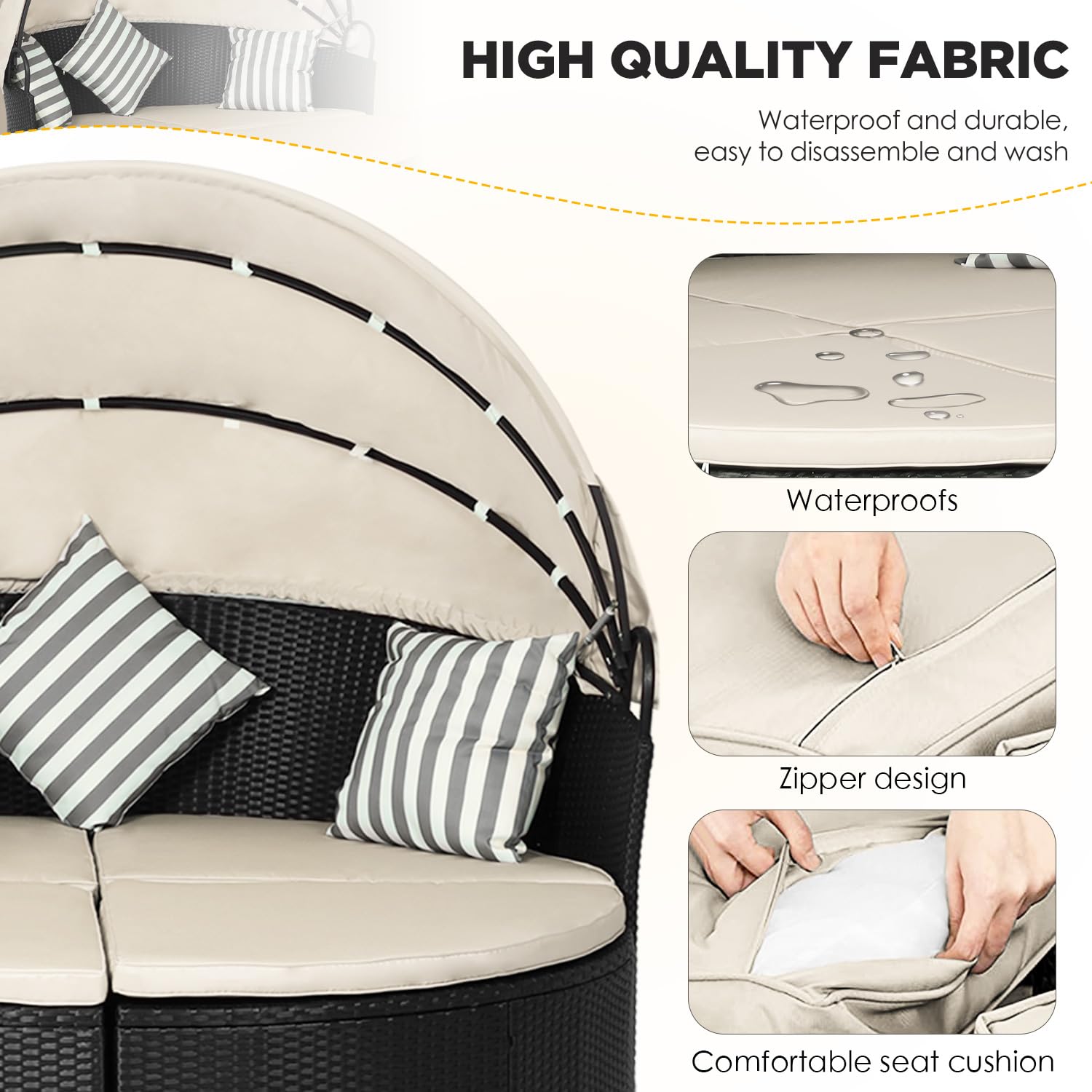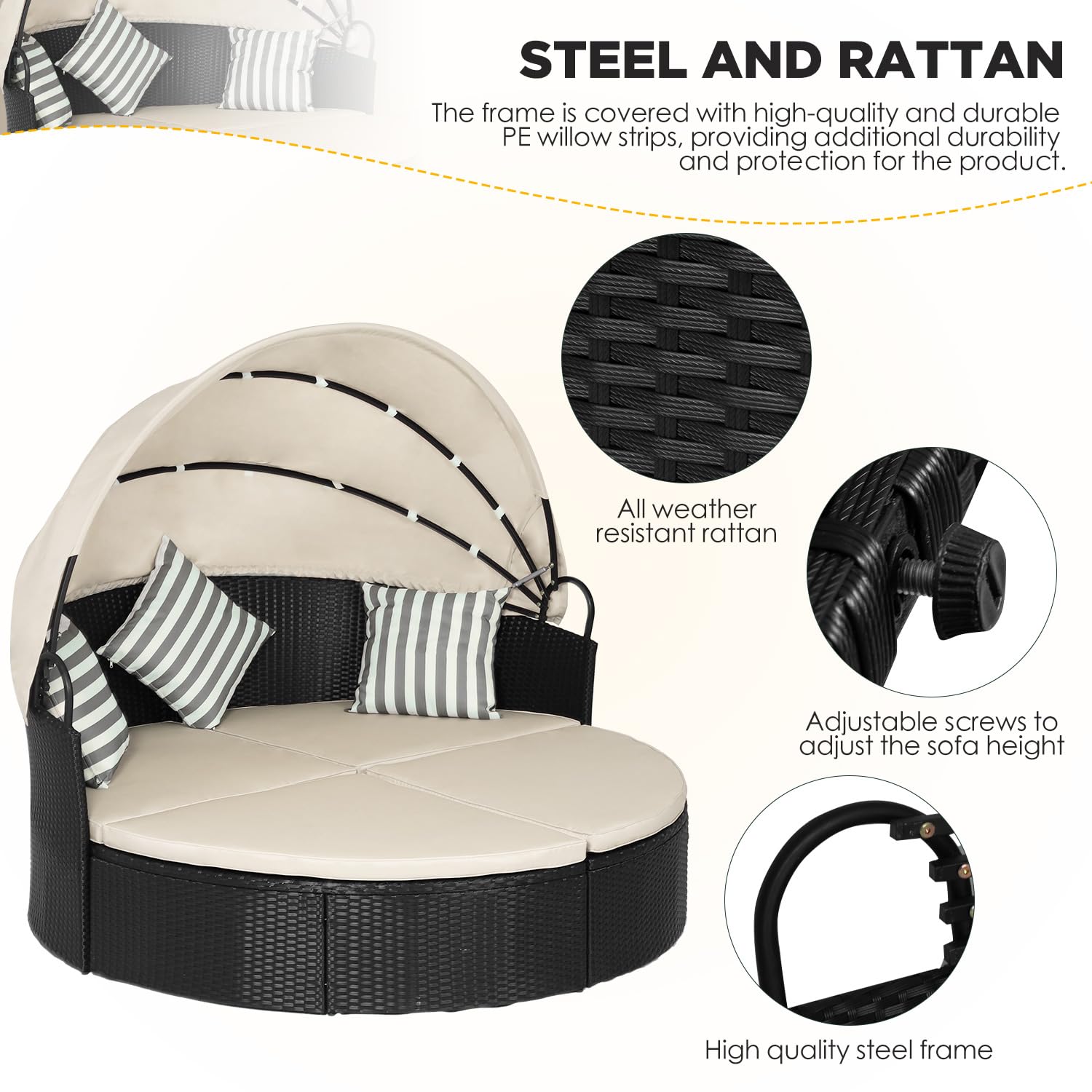 - ♥【UPGRADED COMFORT】-The patio furniture set with telescopic pull rod that provide adjustable canopy. You can enjoy a sun bath in the warm sunshine when closing the canopy or enjoy a cool in the hot weather when opening the canopy.This rattan daybed comes with generous sized thick padded seat cushions and back cushions.The seat cushion of this patio round daybed can be removed for easy cleaning.