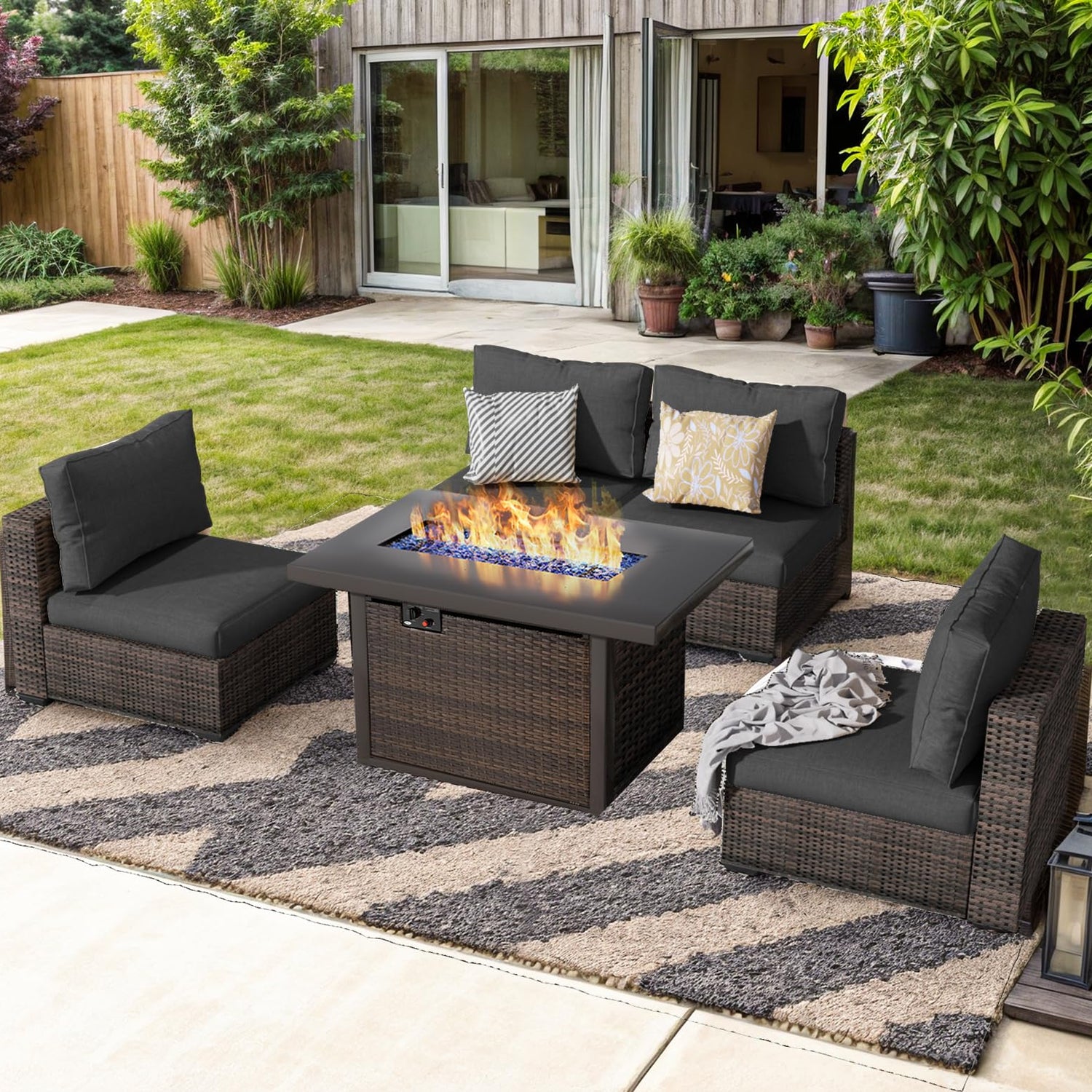 Outdoor Sectional Furniture, 5 Piece Patio Furniture Set with 42-inch Fire Wicker Propane Fire Pit Table - All Weather Wicker Rattan Sofa Conversation Set for Backyard Lawn Poolside Deck, Black