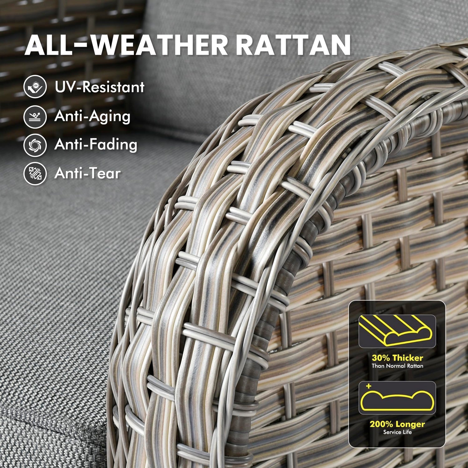 - All-Weather Patio Modular Sectional Sofa Set:Built to last, our All-Weather Patio Modular Sectional Sofa Set is crafted with premium, handwoven PE rattan, designed to withstand rain, snow, and blazing sun. Whether hosting guests or relaxing solo, this patio conversation set — including the outdoor sofa and chair — resists stains and is water-repellent, ensuring effortless maintenance for a pristine backyard oasis