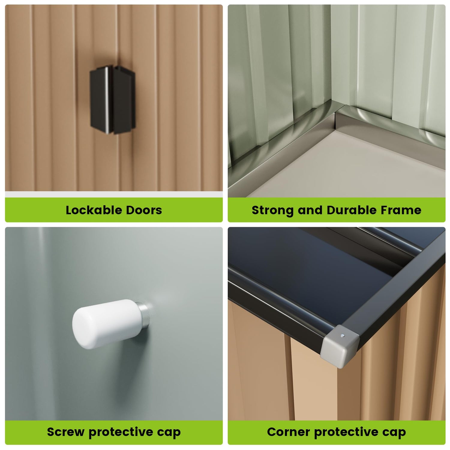 - [ROBUST CONSTRUCTION FOR LONGEVITY] Sturdy Design: With sui generis aluminum frames and galvanized steel panels coated with eco-friendly painting, this shed offers exceptional sturdiness and weather resistance for at least 10 years, preventing collapse and providing reliable protection for your stored items.
