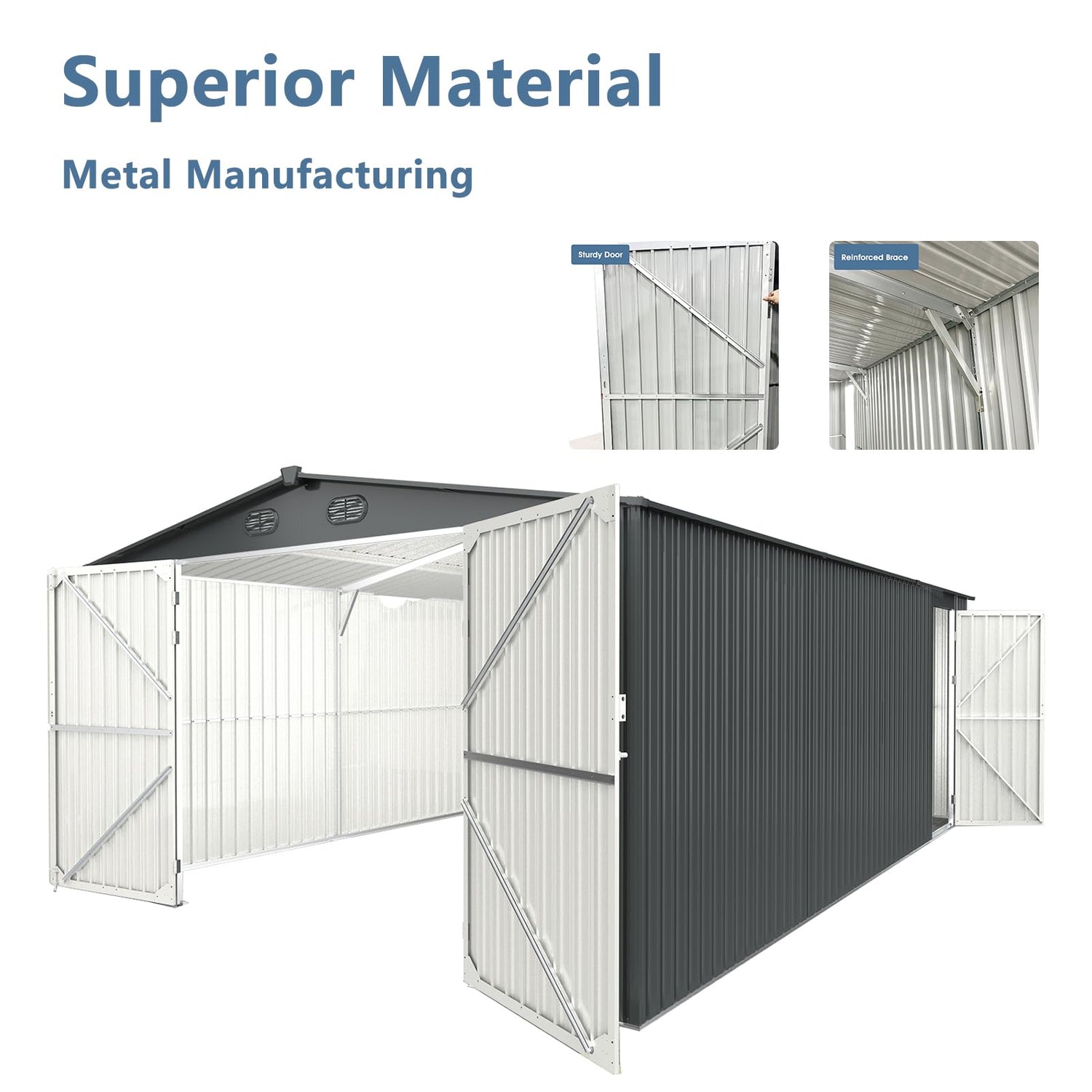 Details: This is a super spacious and enlarged metal storage shed. Outdoor Dimension:W120.5''x D238.6''x H91.3'', covers up 252 sq ft;Thanks to the galvanized steel construction along with a powder-coated finish,the tool storage shed is durable and strong, and won't corrode or be affected by adverse weather conditions. Its double hinged doors in the front allow easy entry and exit. This storage house has 2 vents both in the front and back,ensuring excellent ventilation.It is not only your storage shed, but also your car garage, children's playground. You can place this building in outdoor backyards,gardens, patios.