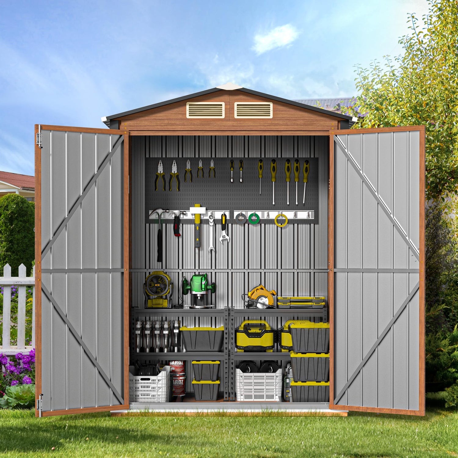 - Sturdy Metal Construction: Its strong construction and the thick galvanized steel we used make this shed long-lasting, non-corrosive, and UV resistant. The overlapped wallboard is waterproof and moisture-proof, making it suitable for usage in all-weather circumstances. The frame floor adds extra stability, ensuring your shed stands strong against wind and weather
