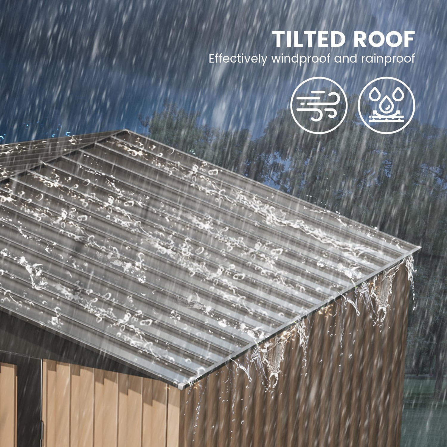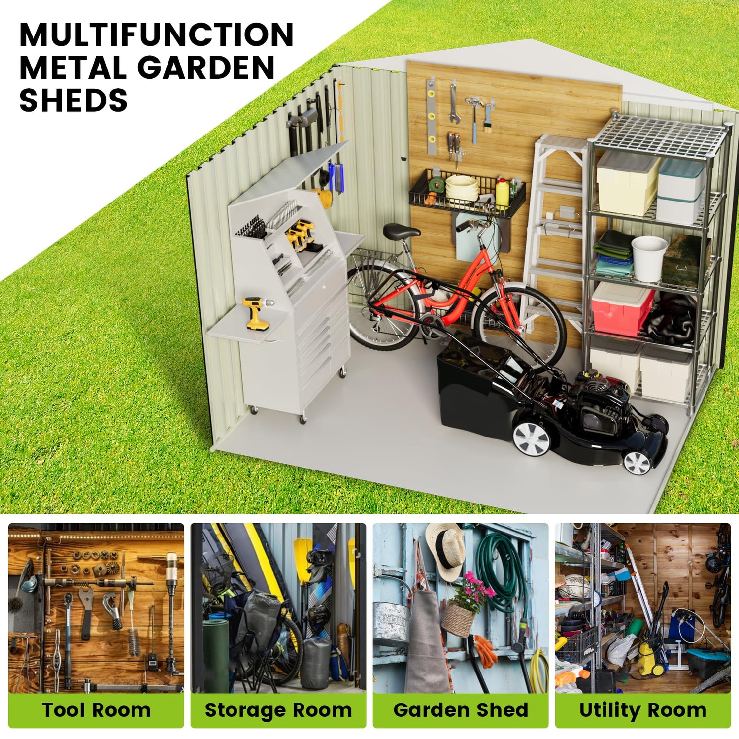 - [STRULY AND STABLE CONSTRUCTION] Engineered for Longevity: Crafted from thick galvanized steel, this tool shed is built to withstand the test of time.The overlapping wall panels offer exceptional resistance to water, allowing for worry-free use in various weather conditions. With this robust design, you can store your items without concern, they're safe and secure against the elements.