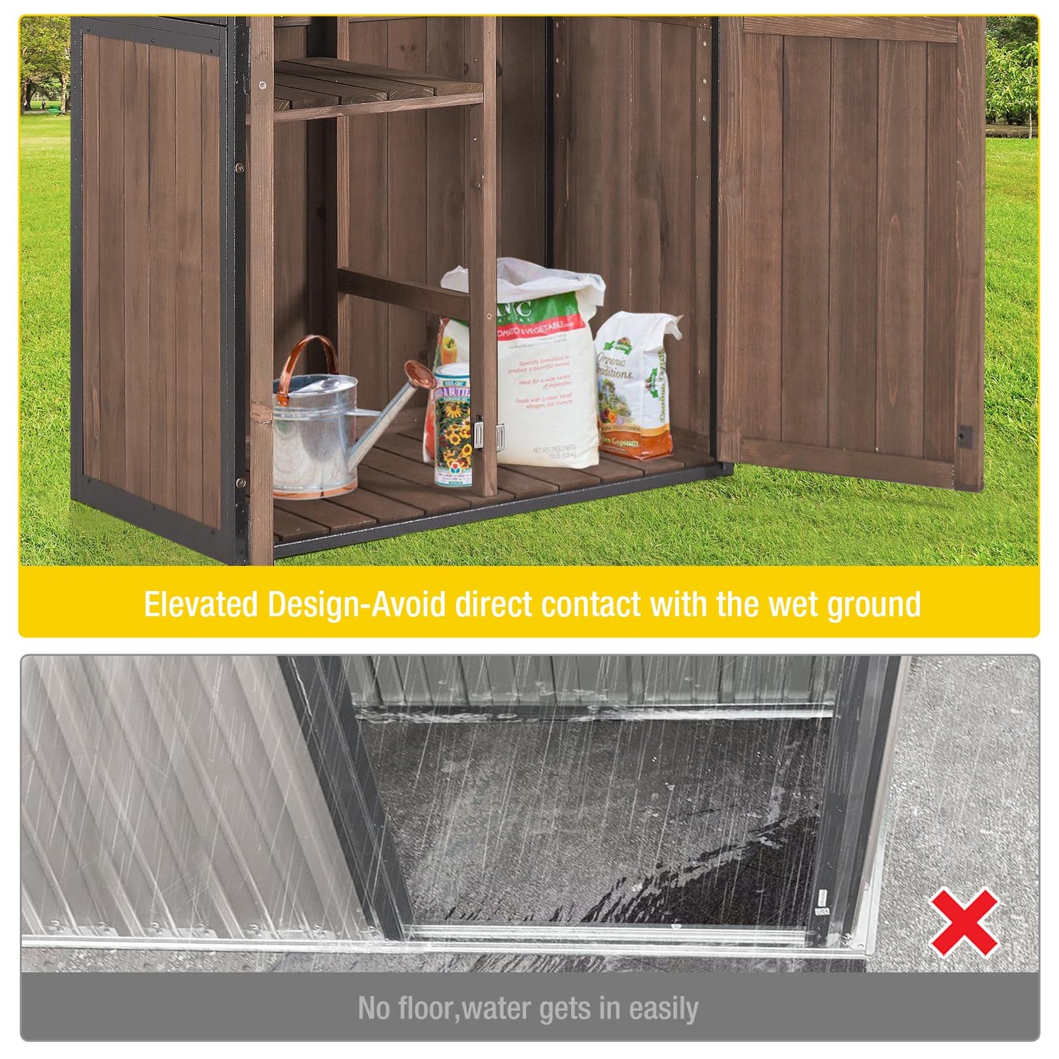 - Weatherproof: The pitch asphalt roof can be waterproof, prevent water accumulation, and raise the wooden floor to prevent water infiltration and ensure dry and safe storage space extend the service life of the garden tool storage shed
