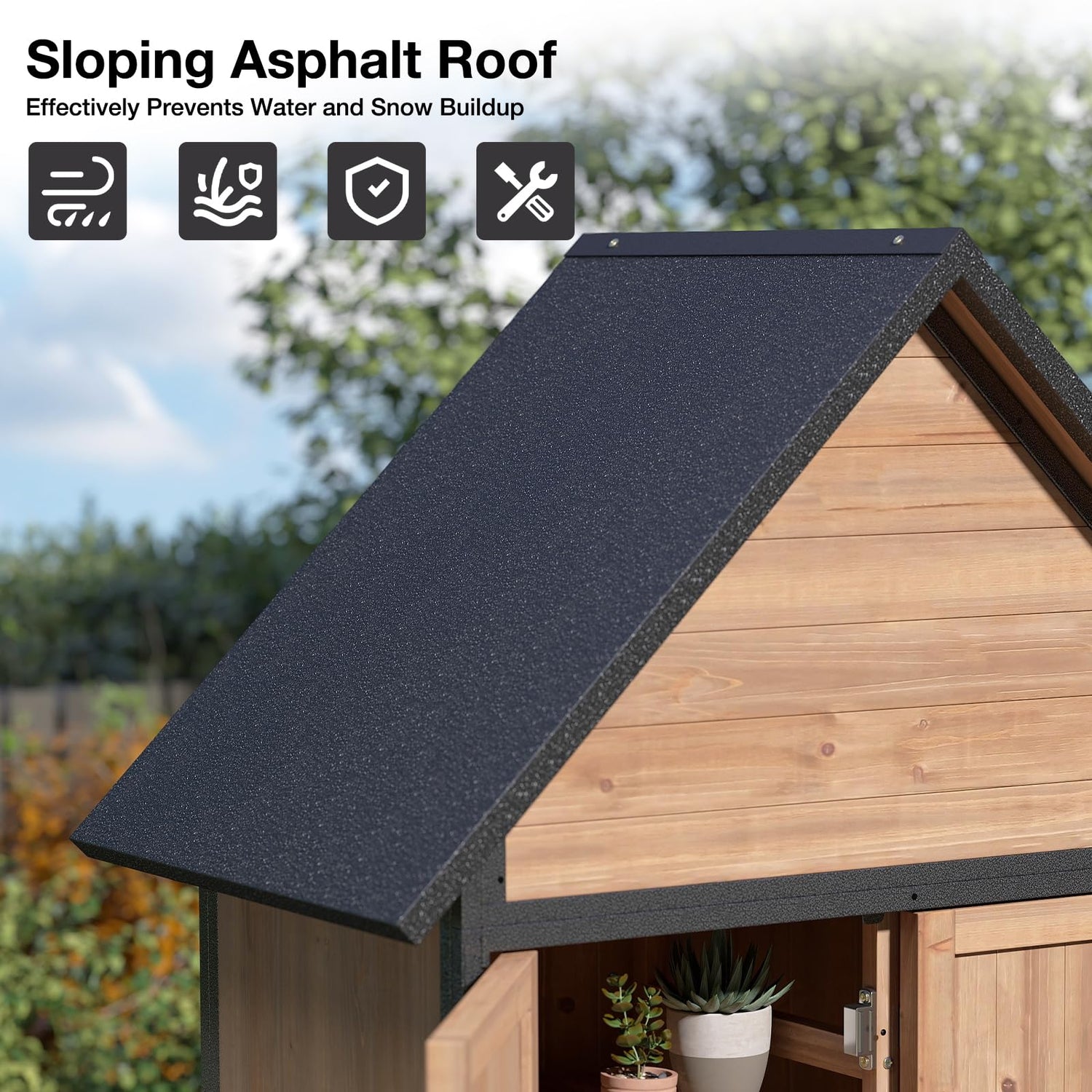 - ๐๐จ๐๐ค๐๐๐ฅ๐ ๐๐จ๐จ๐ซ & ๐๐๐๐ข๐๐ข๐๐ง๐ญ ๐๐ซ๐๐ข๐ง๐๐ ๐ ๐๐จ๐จ๐ โ The lockable door provides security, keeps your tools away from being stolen, and avoids small animals from entering accidently. The sloping roof of this outdoor storage shed also preventing the rainwater accumulation and rusting