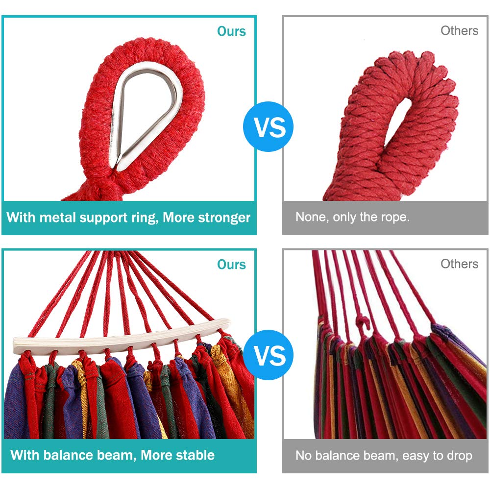 - 【Load Capacity up to 550lb】: The binding ropes at both ends of the hammock are made of nylon, tightly braided and fixed, which greatly increases the load bearing coefficient. And it is made of 18 strands of traction rope, which are Thickened and braided, even tension and safe.