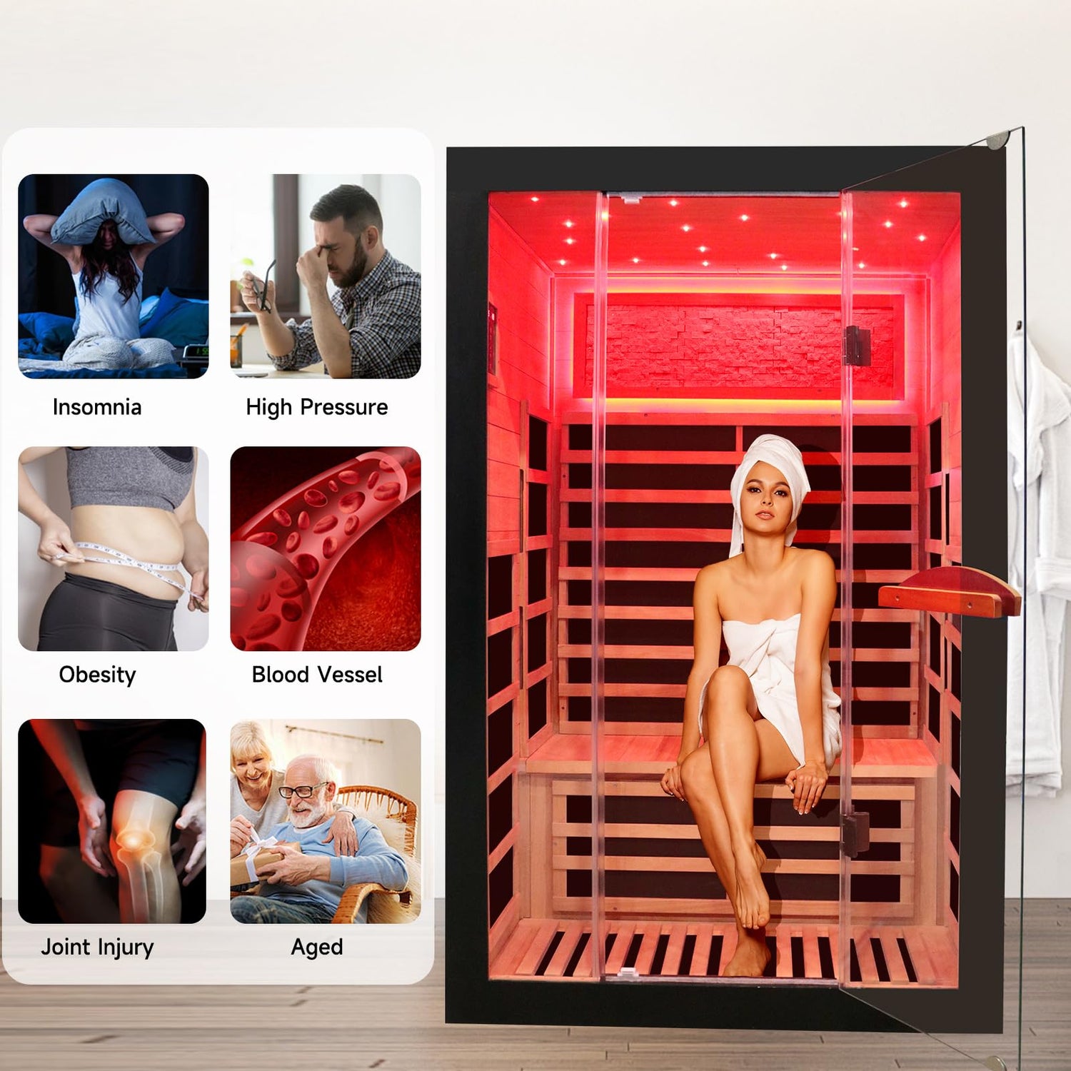 - Safety protection:With 2000W power, excellent insulation materials, and advanced heating panel technology. Eight high-efficiency epoxy boards surround your body and our sauna room reaches the desired temperature in just 30 minutes. Features timer and power adjustment,Temperature setting protection, system protection, hardware protection.