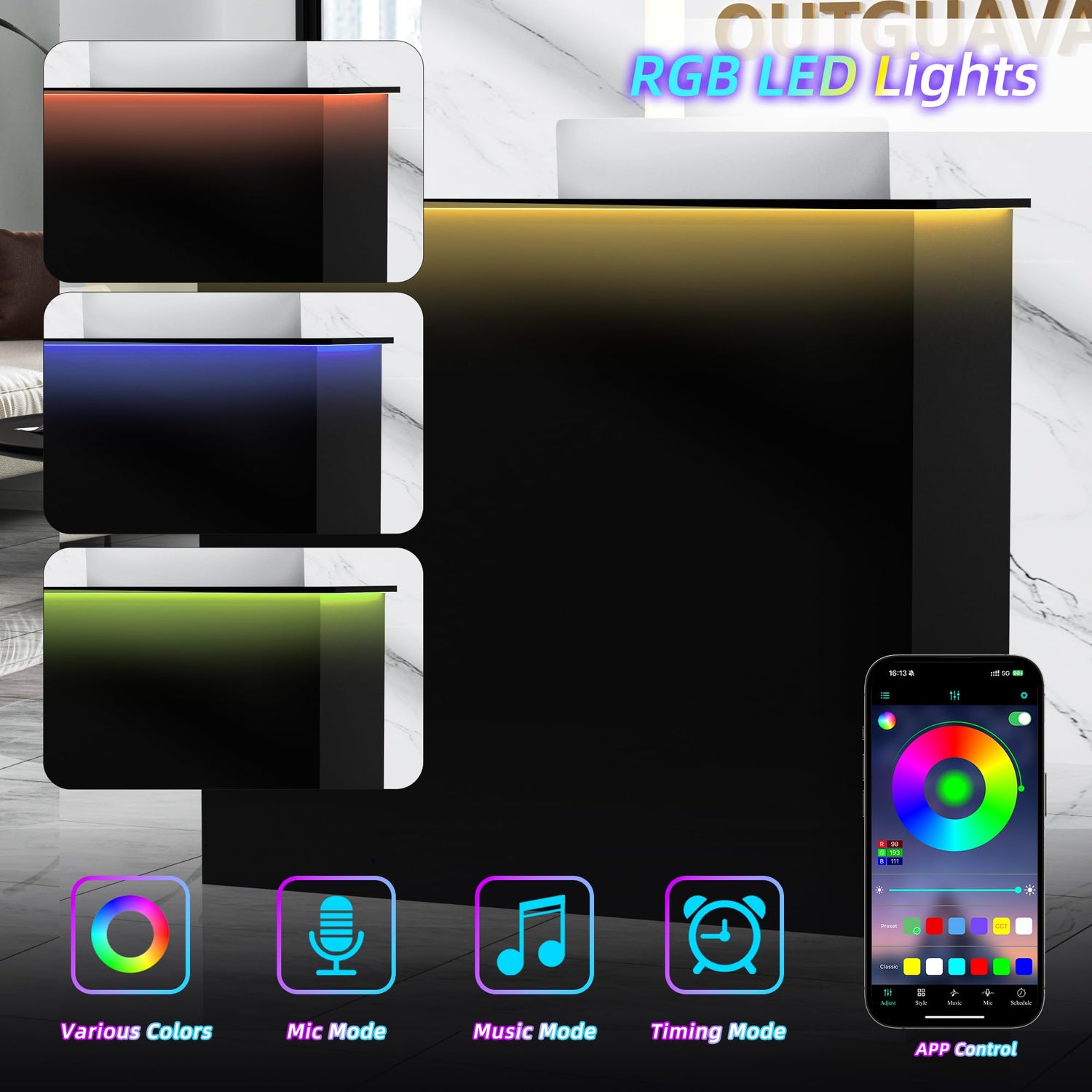 OUTGUAVA Modern Front Desk & Reception Desk with LED Lighting, 50-inch Retail Counter with Power Socket, DIY Stripe for Checkout, Lobby, Salon, Offices - Black
