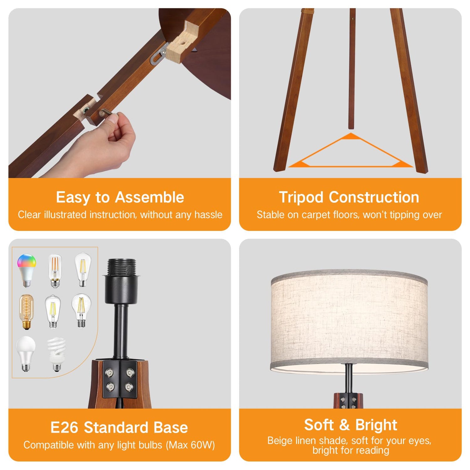 - Stylish Design: OUTON wood tripod floor lamp fits in modern architecture vintage, retro, mid century or traditional decor, in particular. It has an unique stem with three square wooden legged that makes the lamp stable enough. The round linen lampshade (16" x 9") adds a touch of elegance and modernity to any room in your home or office