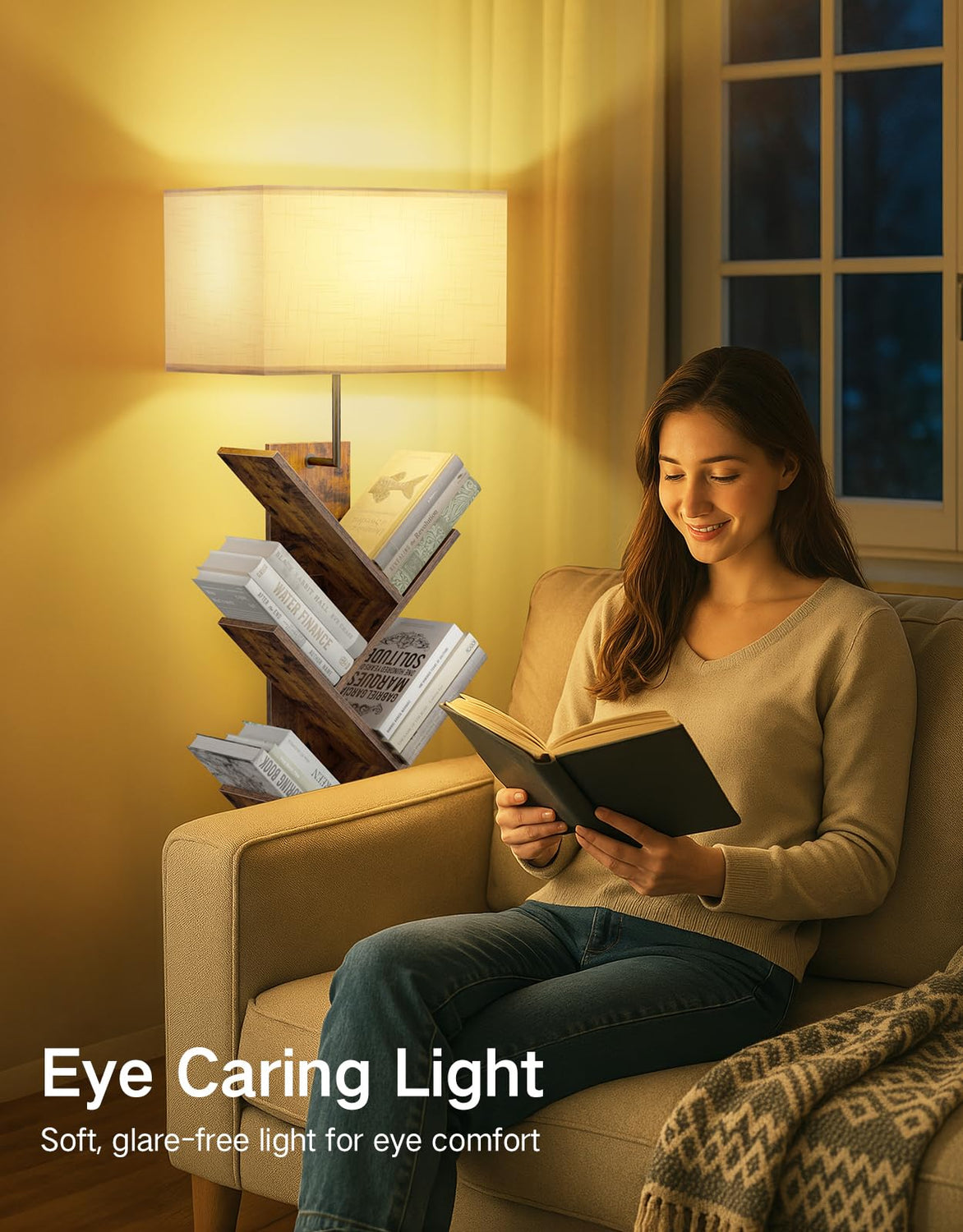 - All-Day Adaptive Lighting – Ideal Ambiance for Any Time: Elevate your reading or relaxation with a built-in adjustable lamp offering 3 color temperature options (Warm, Cool White, and Daylight) and stepless brightness adjustment (10%-100%). Whether focusing in the morning or winding down at night, this flexible lighting provides the perfect brightness and atmosphere. The corner bookshelf lamp built with an anti-glare white lampshade, ensures soft, eye-friendly illumination for comfort at any time of day.