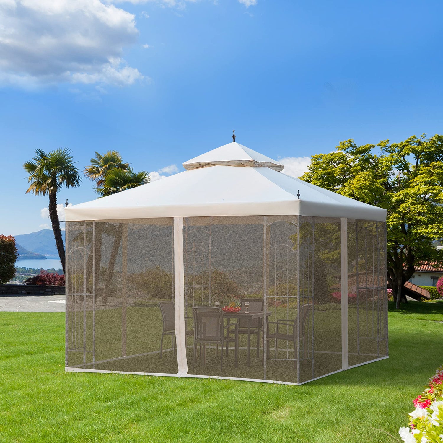 Outsunny 10' x 10' Patio Gazebo with Corner Frame Shelves, Double Roof Outdoor Gazebo Canopy Shelter with Netting for Patio, Wedding, Catering & Events, Cream White