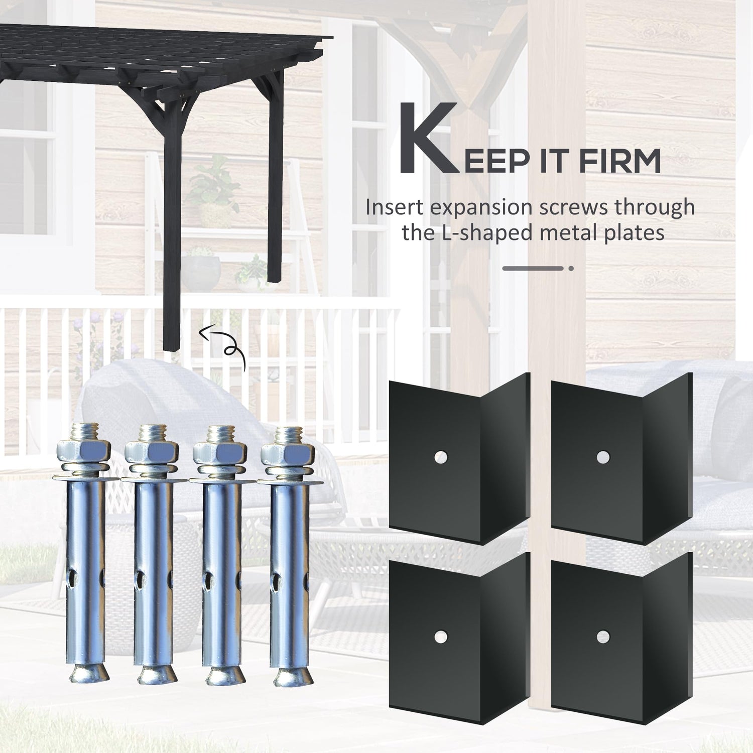 - Year-Round Pergola: Intended to be a permanent structure, our garden pergola is made to endure outdoor conditions year-round. It's made of paint-protected fir wood for water resistance. Included are a set of expansion screws and L-plates to mount it to solid ground such as concrete.