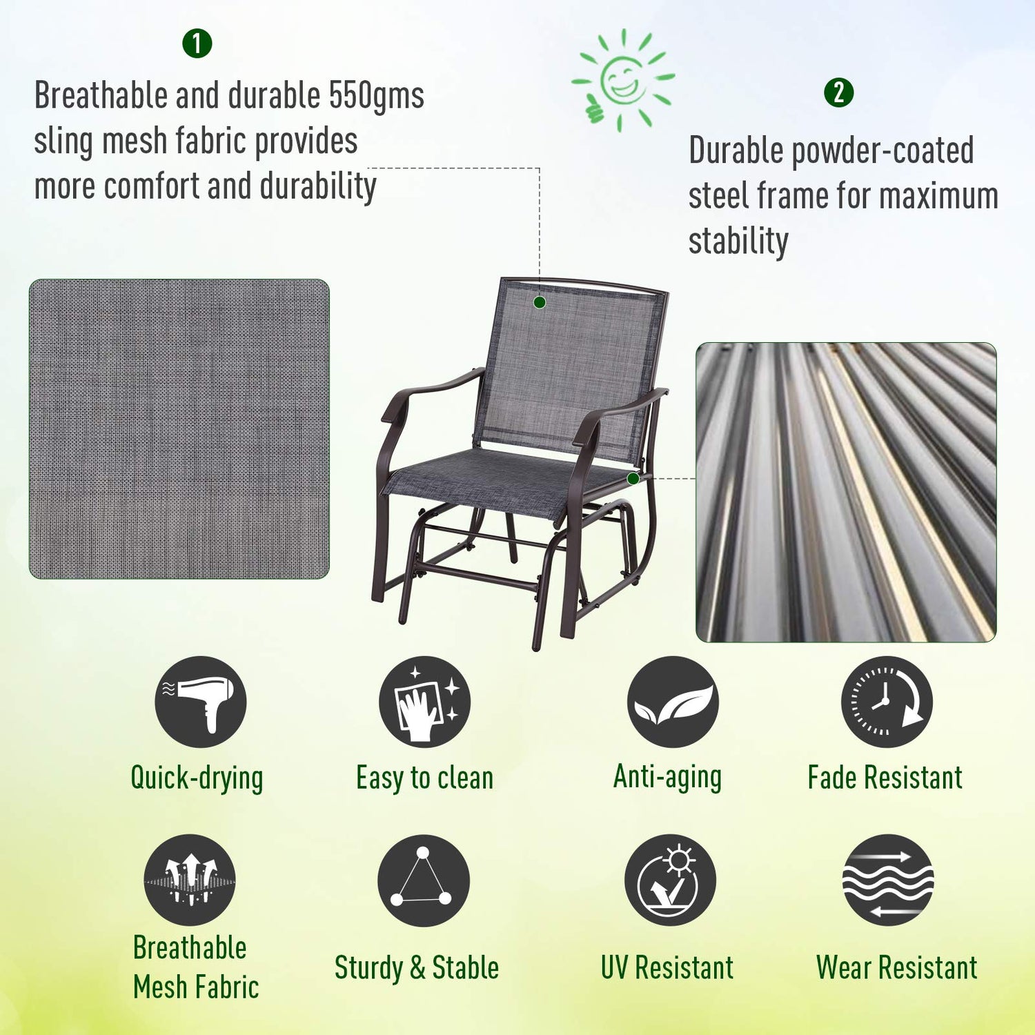 - Outdoor Ready: Our glider chair and table set was made with outdoor in mind; that's why it's made of water safe powder coated steel, and self-drying mesh fabric. It needs no maintenance to have a place on the porch and stays stylish after being out in the sun.