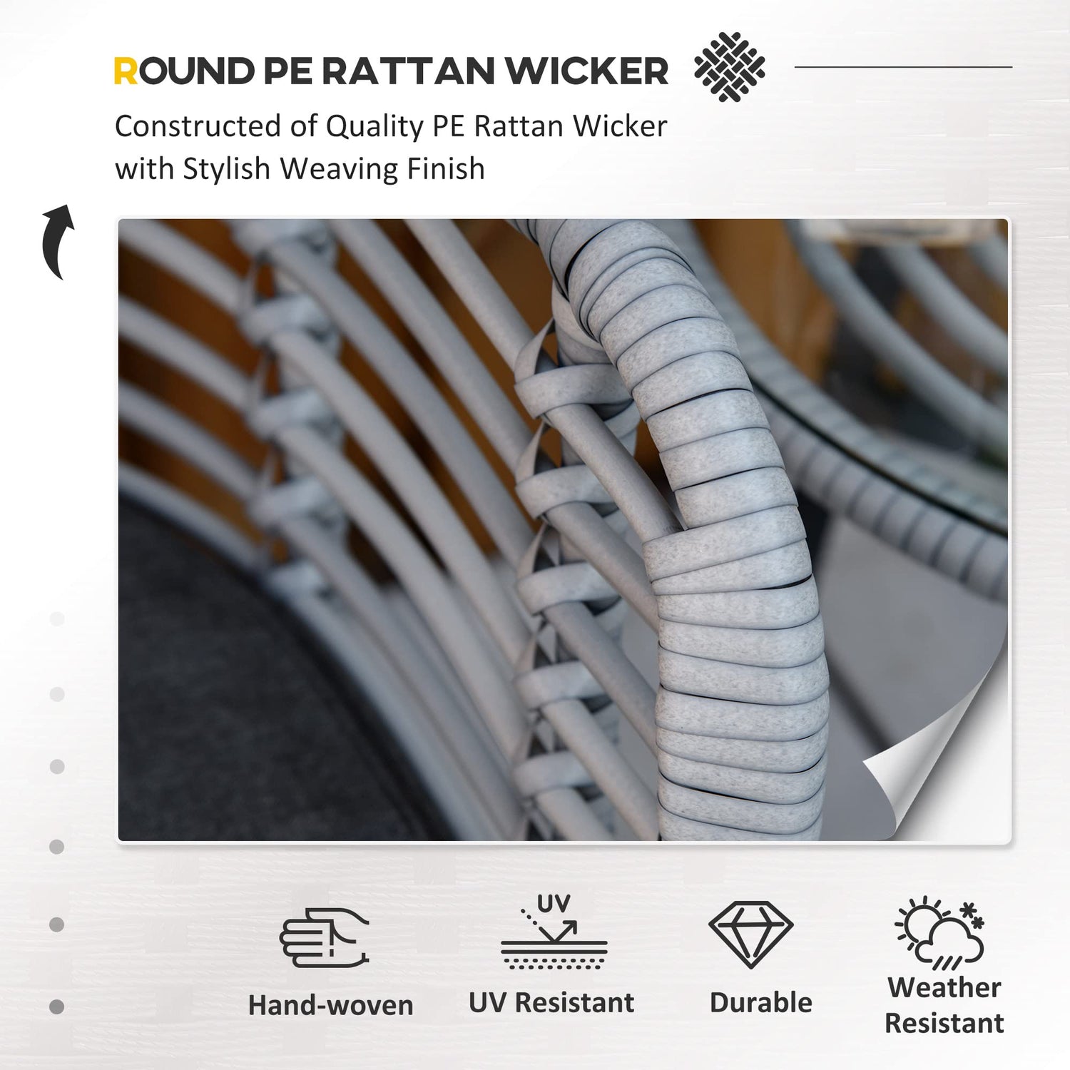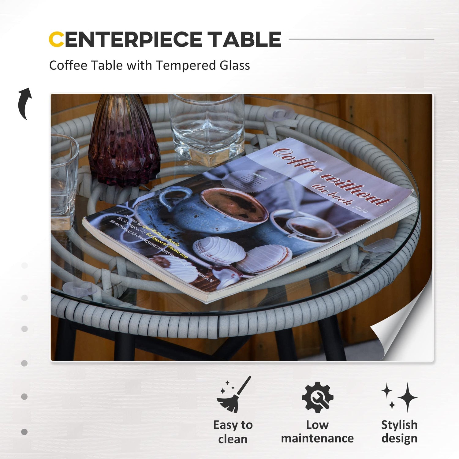 Details: Description:If you want a nice, comfortable place to sit in your backyard but don't have the space or want to buy those super expensive sectional sofa sets, this Outsunny bistro table set would be a great buy this summer. You can use our balcony furniture set to catch up with a friend while enjoying a cold drink or snacks while soaking in the sunshine of a beautiful day. This front porch furniture is the addition you're looking for, so you can get the most out of the spring and summer seasons.Features:● 3-piece outdoor patio bistro set includes two round wicker woven chairs and one coffee table● Combination of durable round PE rattan and steel frame decorates your outdoor space● Round coffee table with tempered glass top for easy cleaning with a damp cloth● Soft padded cushion for comfort, cushion cover with zipper for easy removal to wash● Extra-wide seat and curved armrest provide extra comfort● Assembly requiredSpecifications:● Color: Grey Rattan, Mixed Grey Cushion● Material: Steel, PE Rattan, Polyester● Chair Dimensions: 23.25" W x 26" D x 29.5" H● Seat Dimensions: 20" W x 20.75" D● Seat Height: 14.5"● Tea Table Dimensions: 17.75" W x 17.75" D x 19.75" H● Weight Capacity: 352 lbs. (chair), 33 lbs. (table)● Item Label: 863-086LGPackage Includes:- 2 x Chairs- 1 x Coffee table- 1 x Manual