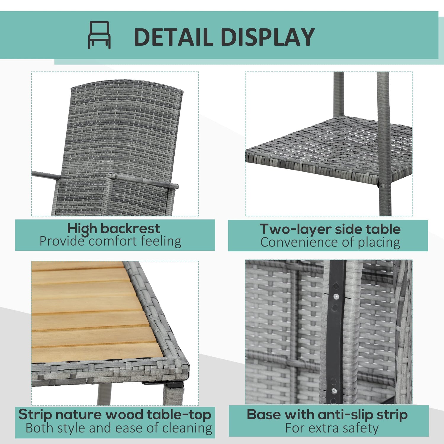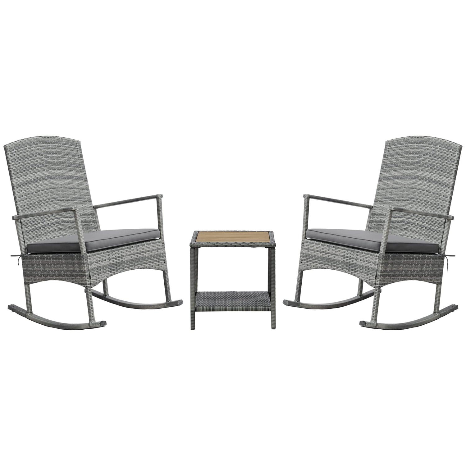Outsunny 3 Piece Patio Rocking Chair Set, 2 PE Wicker Rocking Chairs, Cushioned, 1 Two-Tier Wood Slat Coffee Table, Rattan Front Porch Furniture, Gray