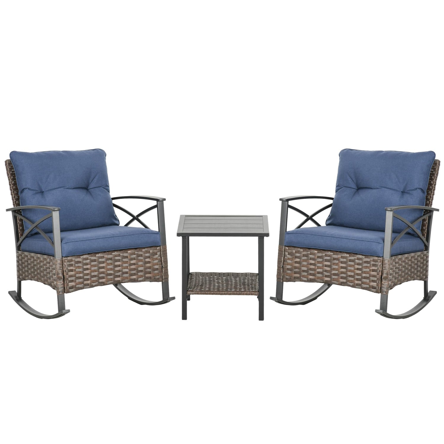 Outsunny 3 Piece Patio Rocking Chair Set, Outdoor Wicker Bistro Set with 2 Cushioned Porch Rockers and 2 Tier Coffee Table for Garden, Porch, Backyard, Dark Blue