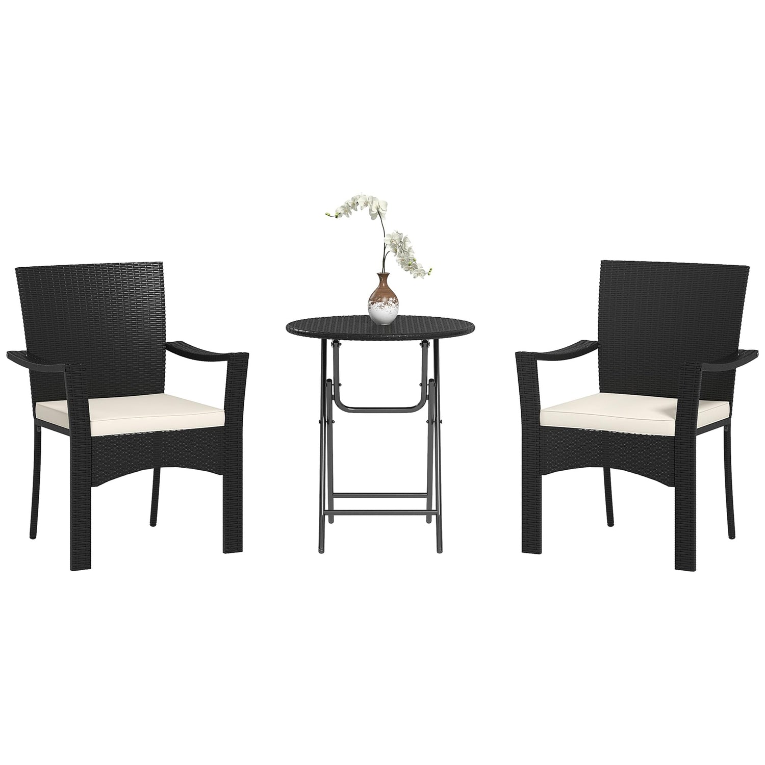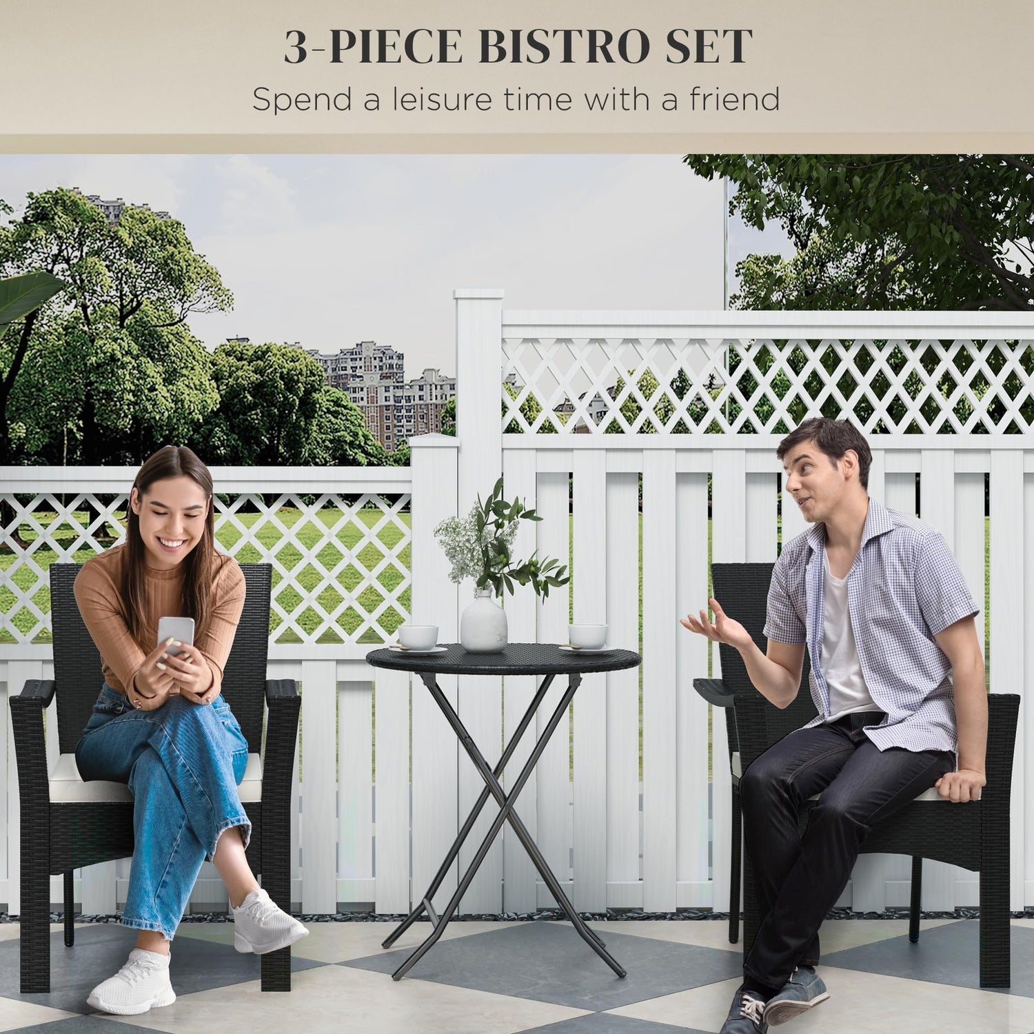 Outsunny 3 Pieces Wicker Outdoor Bistro Set, Rattan Patio Furniture Set with Folding Coffee Table, Porch Chairs with Cushions for Backyard, Balcony, Garden, White