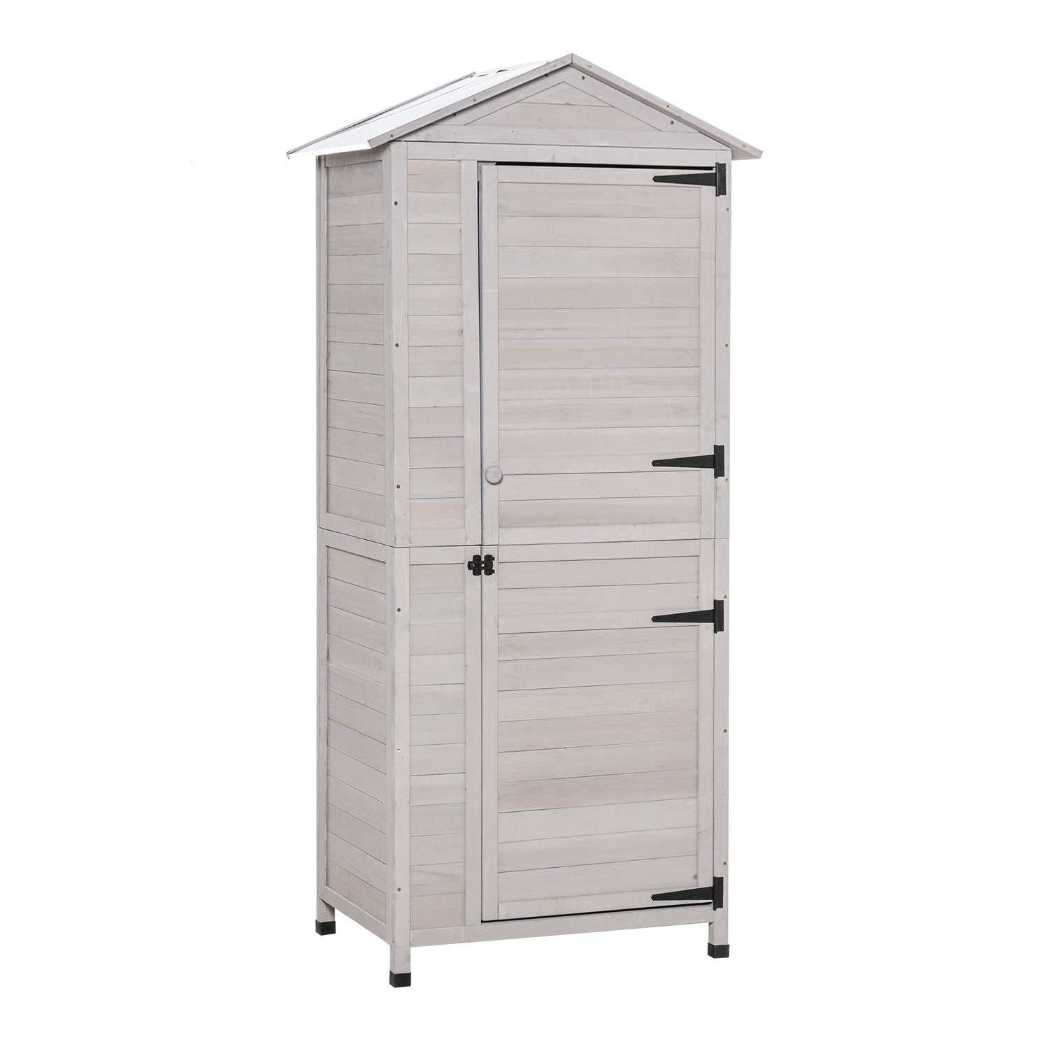 Outsunny 36" x 25" x 79" Wooden Storage Shed Cabinet, Outdoor Tool Shed Organizer with 4-Tier, 3 Shelves with Handle Tin Roof Magnetic Latch Foot Pad, Light Grey