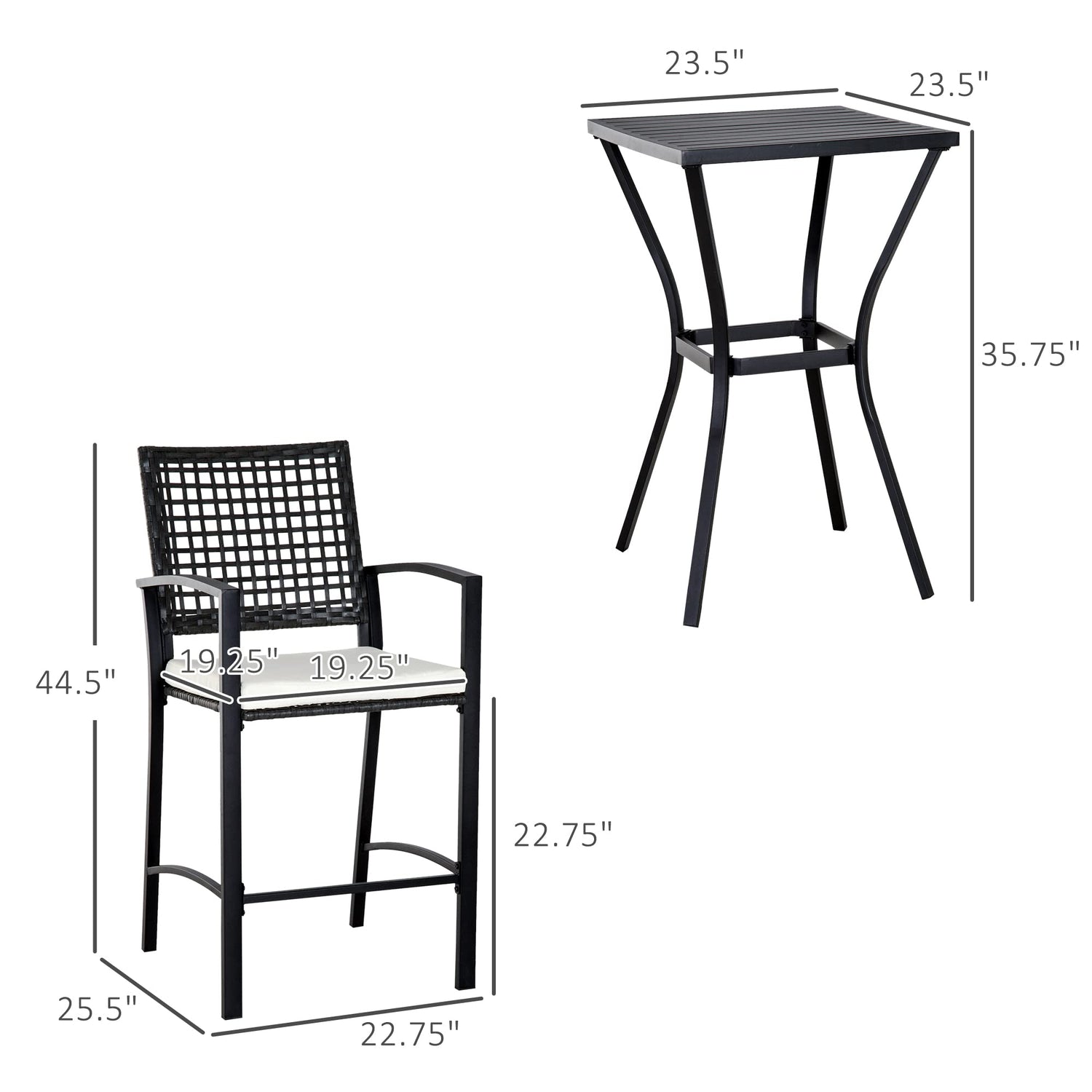 Details: Description:This bistro set with classic style bar stool seating creates the perfect place for you and your family or friends to gather and enjoy each others company! This set includes 1 table and 2 cushioned bar stools with built-in footrest. Built to last using all-weather rattan wicker, a solid steel table top, and sturdy steel frame. The unique blend of steel slates on a durable PE wicker body requires little maintenance and will stay looking new for years to come. This furniture set is the perfect decorative yet functional addition to your outdoor living space. Update your outdoor space today with this great patio bar set by Outsunny!Feature:- This classic 3pc wicker bar set with 1 table and 2 stools, is a perfect addition to any outdoor area - Constructed of weather and UV resistant PE wicker, great for outdoor use - With high quality steel construction, our barstools can bear 350lbs weight so that they are more sturdy' - Cushioned barstools with built-in armrest and footrest, provides a place to rest your feet and arms - Zippered cushion with removable cover for easy washing - A large steel top table creates a centerpiece for this sets for both style and ease of cleaningSpecification:- Rattan Color: Black - Cushion Color: Cream White - Material: Steel, PE Rattan - Bar Table Dimension: 23.5 " L x 23.5 " W x 35.75 " H - Stool Dimension: 22.5" L x 25.5" W x 44.5" H - Seat Size:19.25" Wx 19.25" D - Seat Height:2.75" H - Table Weight Capacity: 110 lbs - Stool Weight Capacity: 350 lbs/per seat