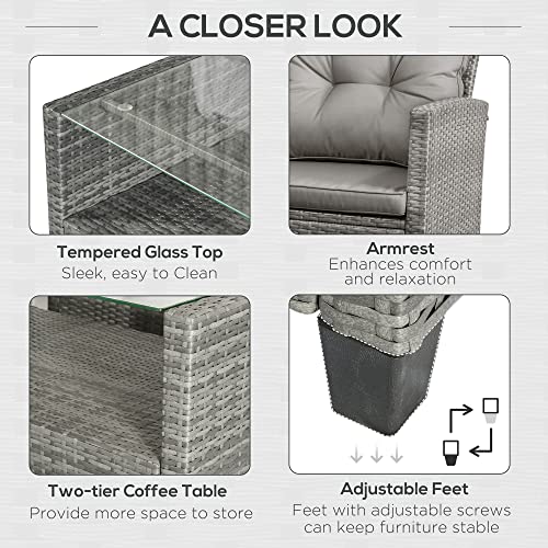 Outsunny 4 Pieces Patio Furniture Sets with Cushions, PE Rattan Wicker Conversation Chairs with Two-Tier Coffee Table for Backyard Porch Garden Poolside and Deck, Gray