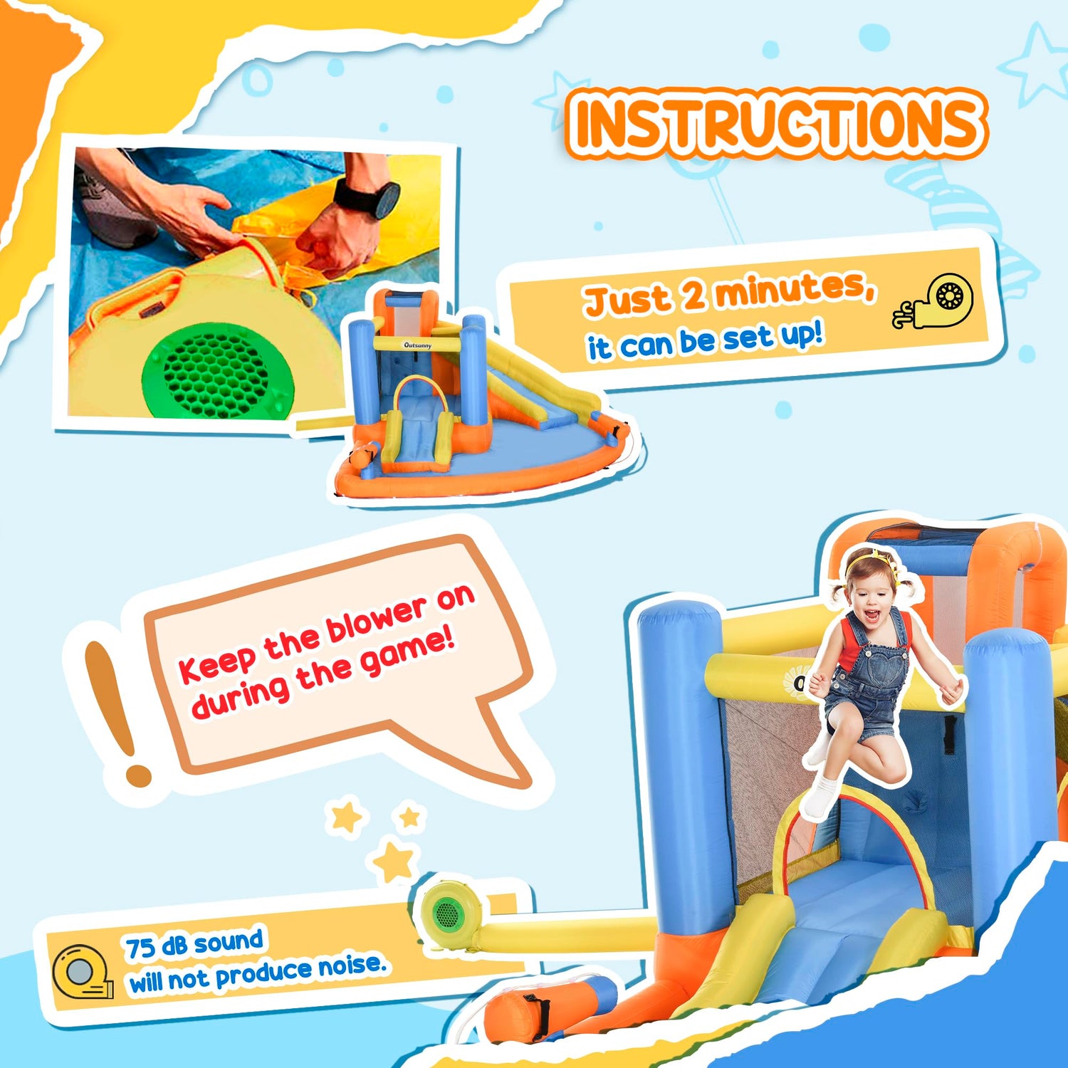 Outsunny 5-in-1 Kids Inflatable Bounce House Jumping Castle with Water Pool, Slide, Climbing Walls, & 2 Water Guns, Orange, Blue, Yellow