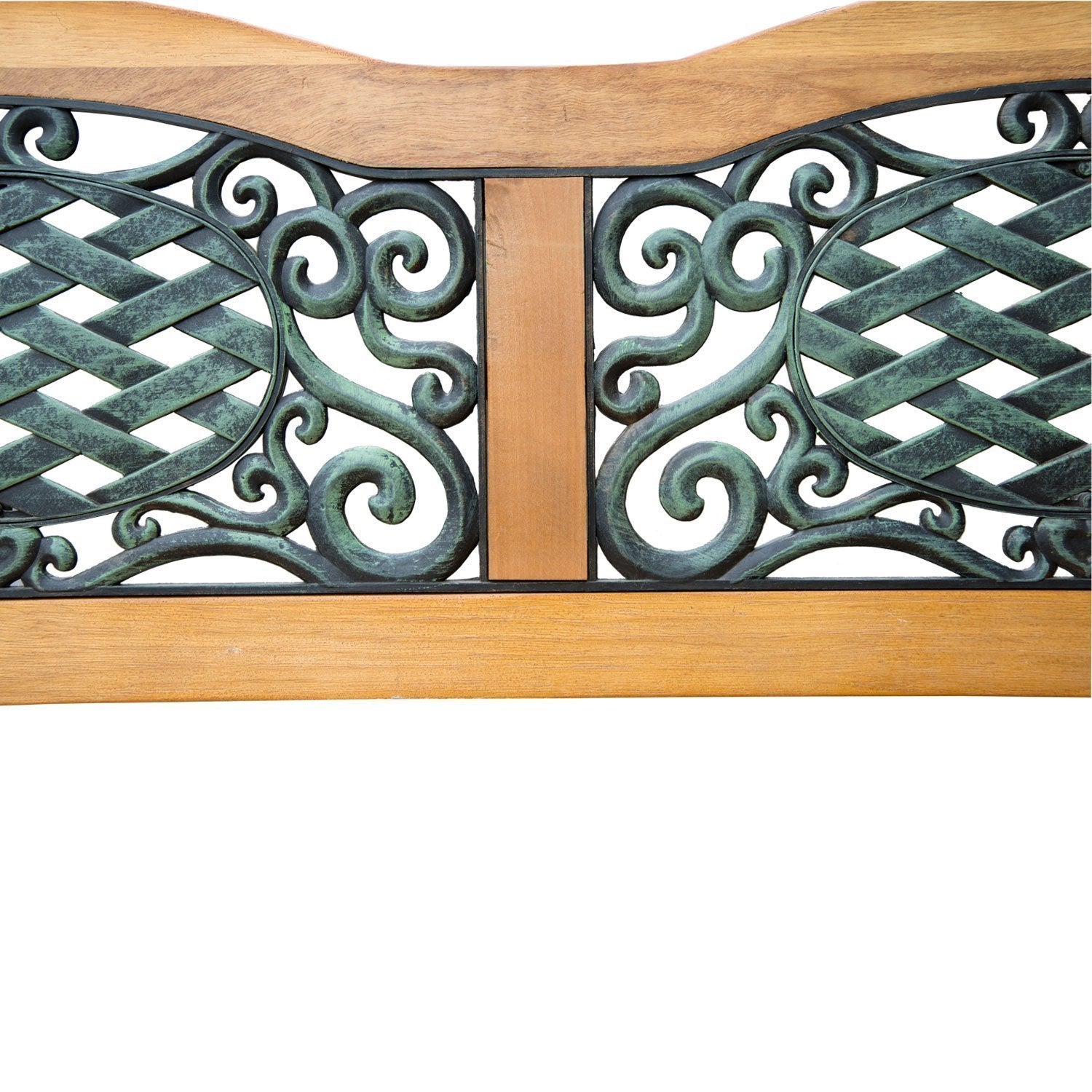 - Wood & Metal Garden Bench: Our patio bench is crafted from sleek natural wood and fine metal flourishes. Two lattice patterns are displayed on the back, evoking the antique beauty of a park bench in your garden, porch, or anywhere else.