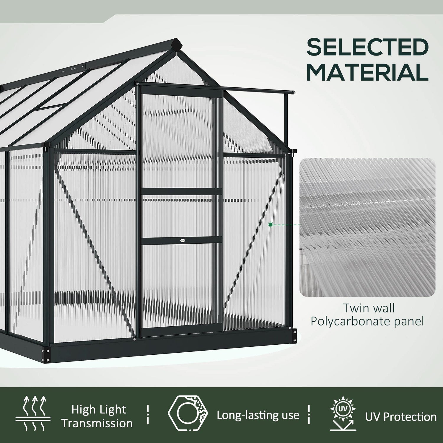 - Polycarbonate Greenhouse: Elevating humidity with superior insulation, transparent polycarbonate panels make our greenhouse ready for outside conditions. They allow in nourishing sunlight while still blocking scorching UV.