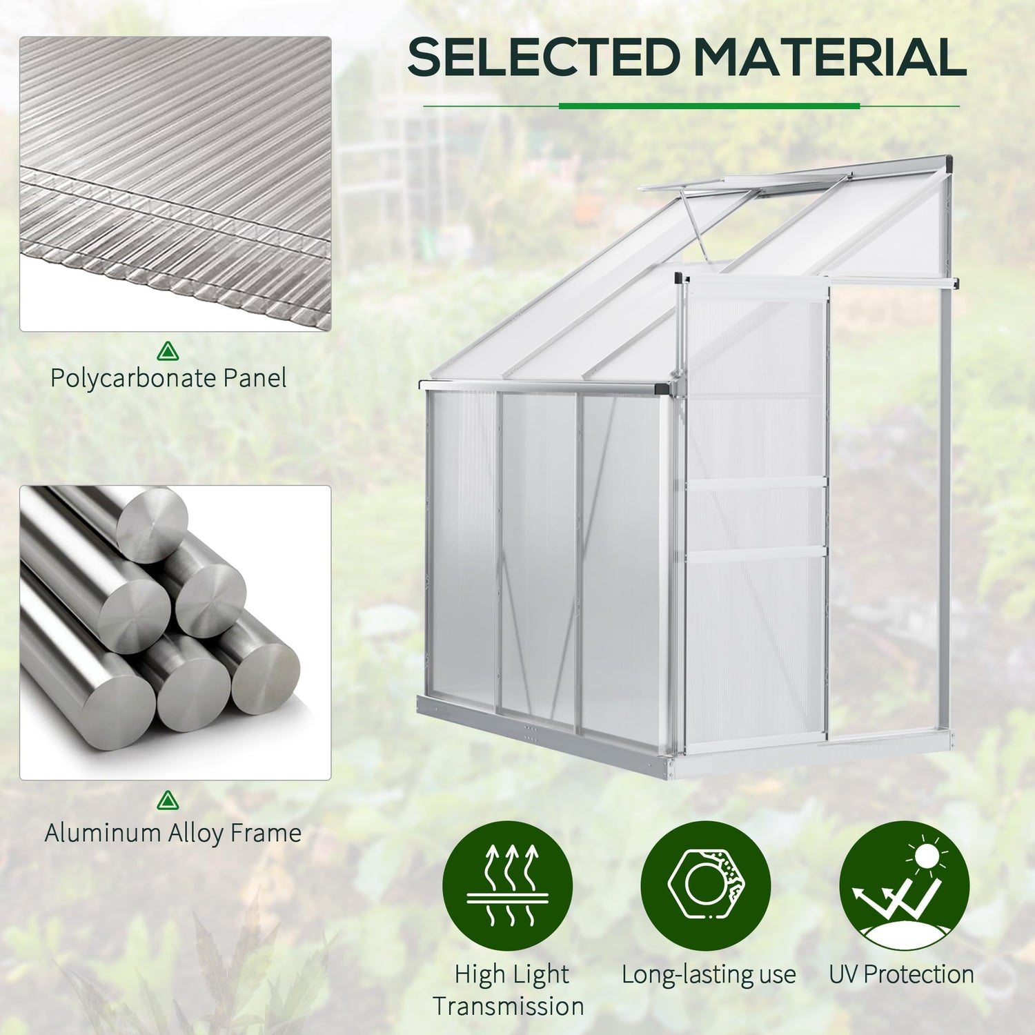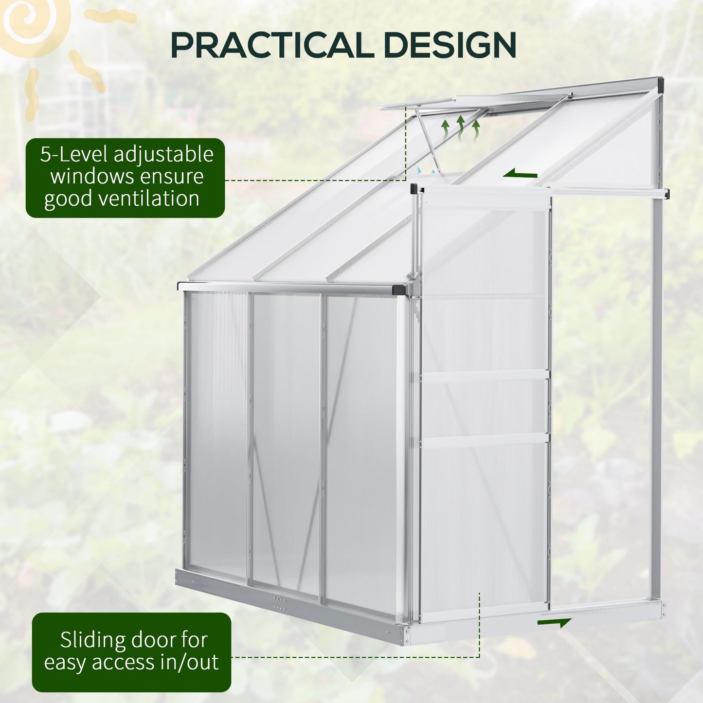 - Lean-To Wall Design: Lean-to-wall design is space-saving; the spacious walk-in greenhouse can help you grow and nurture plants all year round, protecting them from cold. Our garden greenhouse is perfect for vegetables, fruit, herbs, and flowers.